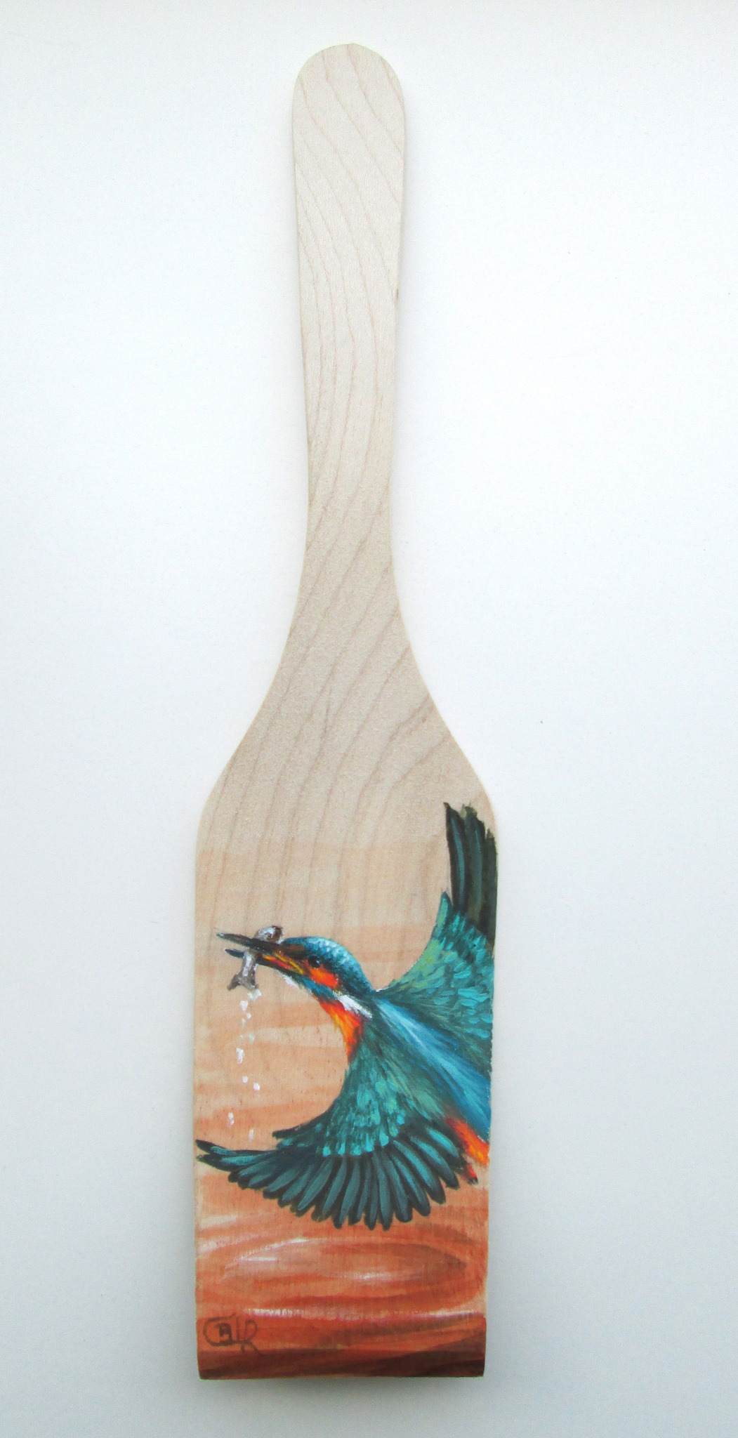 Beschilderde houten spatel. IJsvogel aan het vissen. Lengte 29cm. Breedte 6cm. Prijs is exclusief verzendkosten. Die zijn €7,95 als basispakket met track and trace.