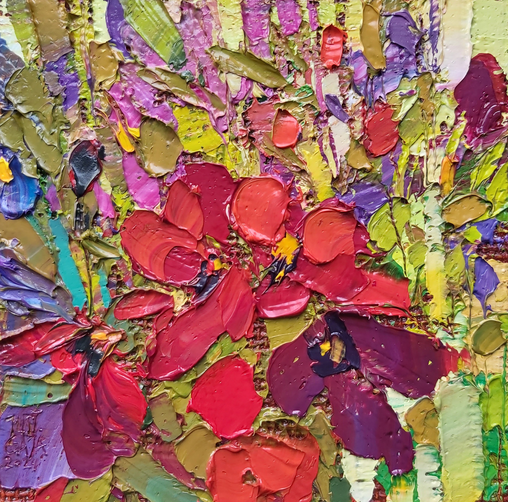 Schilderij Abstract Rood Oranje Geel Paars Groen Bloemen Klein Art Kleurrijk Oil Canvas Kunst Painting Flowers Figurative Paletmes Artist Impression Small Happy Woonkamer Levendig Viooltjes