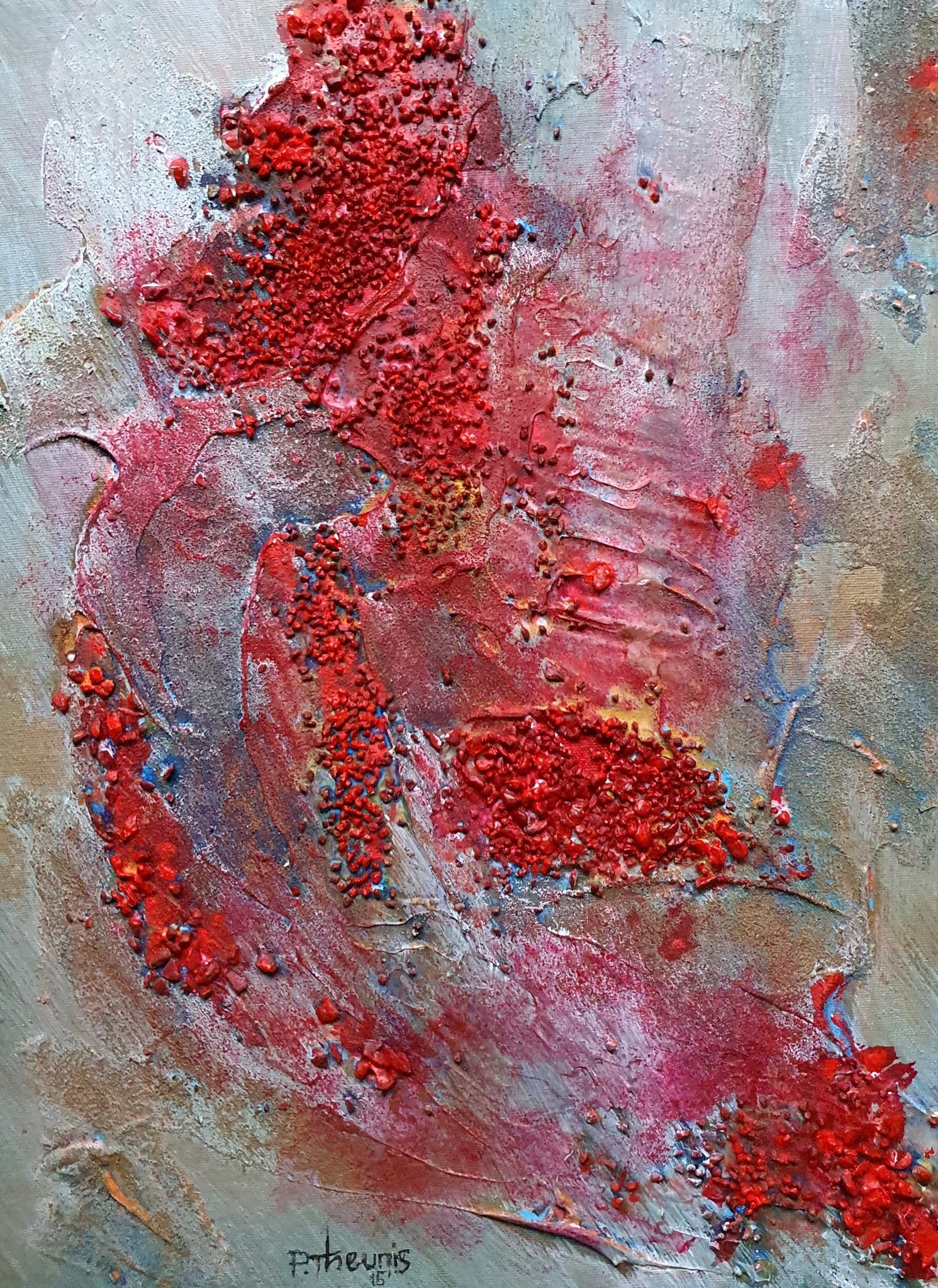 Abstrakt media in acryl, gebruik makend van oa zand, steentjes en modeling paste
