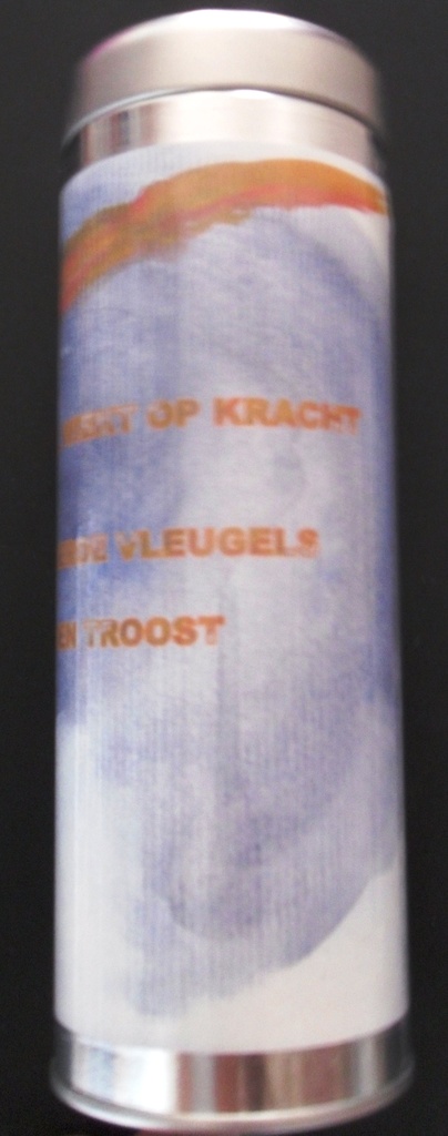 In de metalen bus zaten theezakjes, toch zal het geen toeval zijn dat de bus exact de juiste maten heeft voor koffiepads. Gepersonaliseerd met dit geschilderde gedichtje voor een rusteloze wereldreiziger. TANIGE VOGEL WIEKT OP KRACHT GEROUTINEERDE VLEUGELS BRENGEN TROOST Kijk voor de hele prent bij Troost in de groep Pen en penseel.