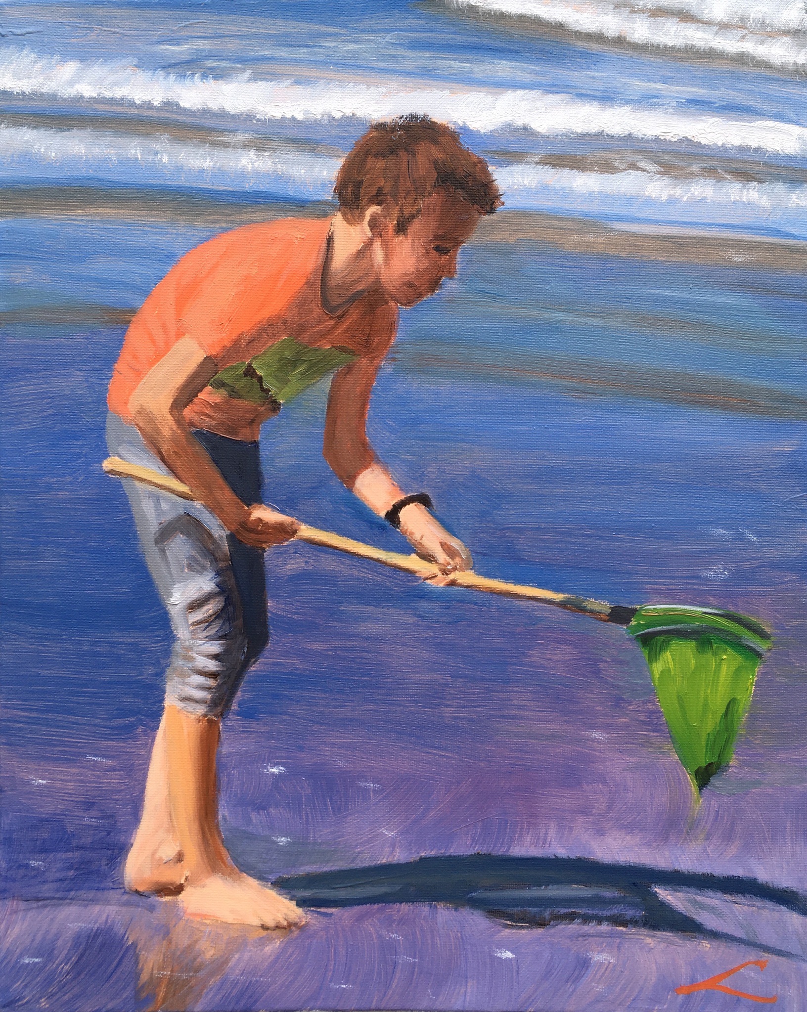 Jongen met een visnet aan zee, geschilderd met olieverf op doek.