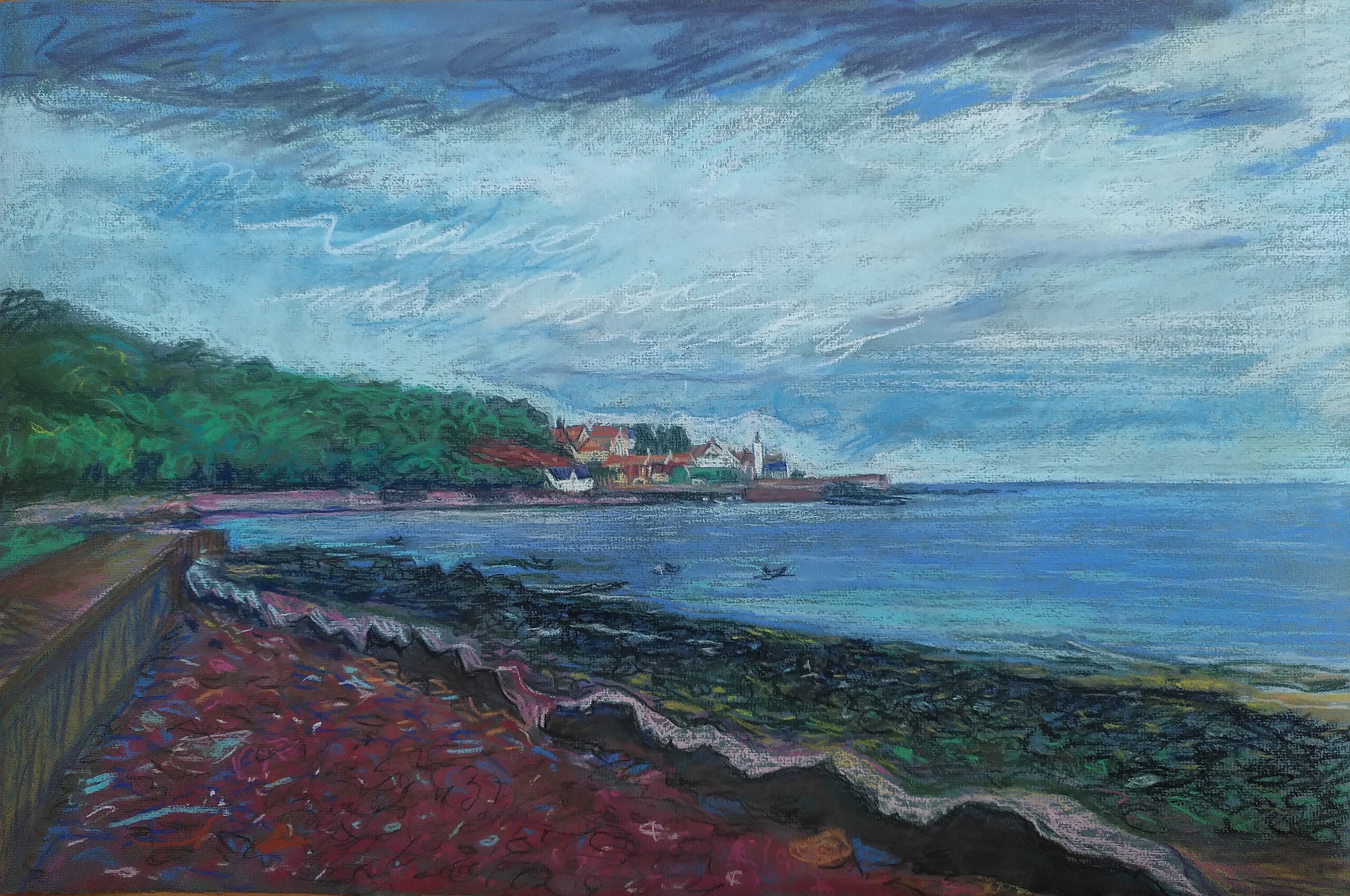 Een ruig strand vol oude bakstenen, afgehapt zeewering en gladde rotsen, biedt een prachtig uitzicht over de volgende zeedorp.