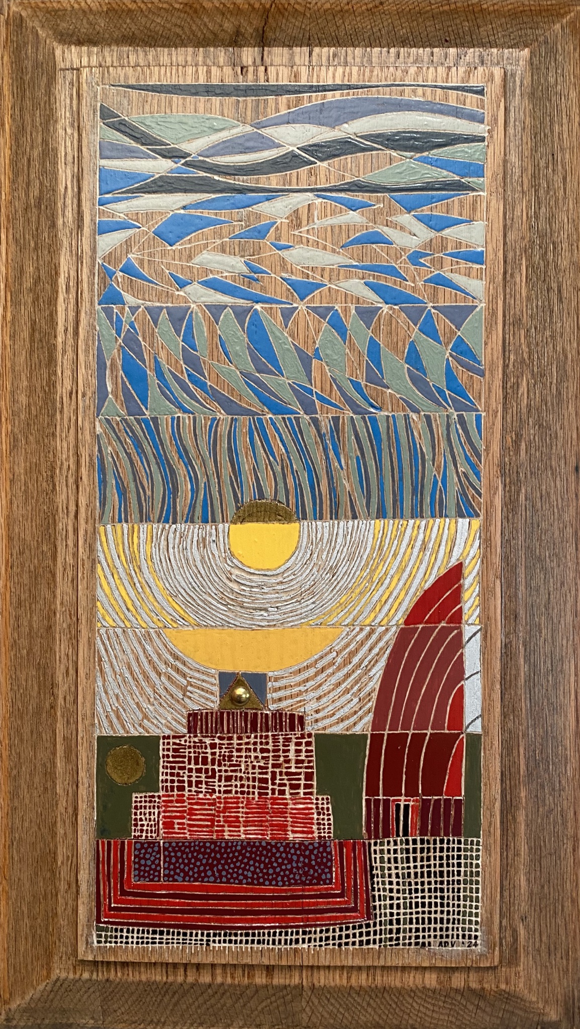 Paneel uit deurtje van een kast die een jaartje buiten heeft gestaan om verwering te bereiken. De lijnen in het hout zijn getrokken met een multitool zaagje. De zaagsnedes zijn deels dichtgesmeerd met witte kit, de vlakjes tussen de lijnen opgevuld met verschillende kleuren.