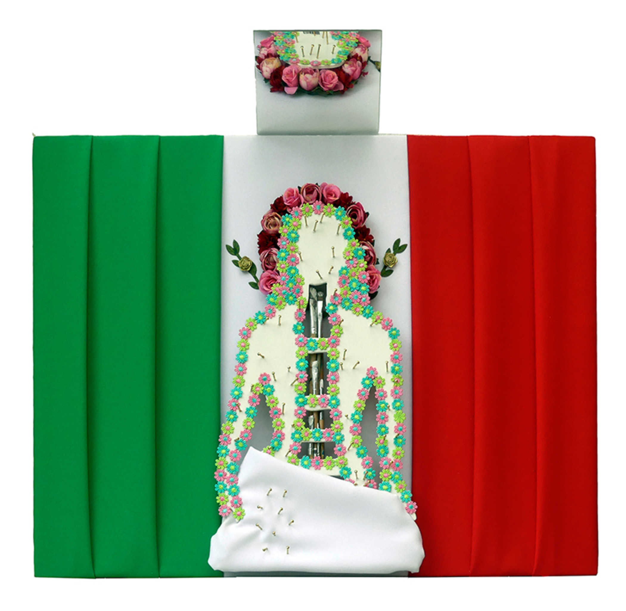 'El reflejo del pincel' Geïnspireerd door de schilderij van Frida Kahlo. ‘De Gebroken Kolom’ Gemonteerd op de Mexicaanse vlag en de kolom vervangen door penselen. The Broken Column werd geschilderd kort nadat Kahlo een wervelkolomoperatie had ondergaan. Boven het kunstwerk is een spiegelte gemoneerd.