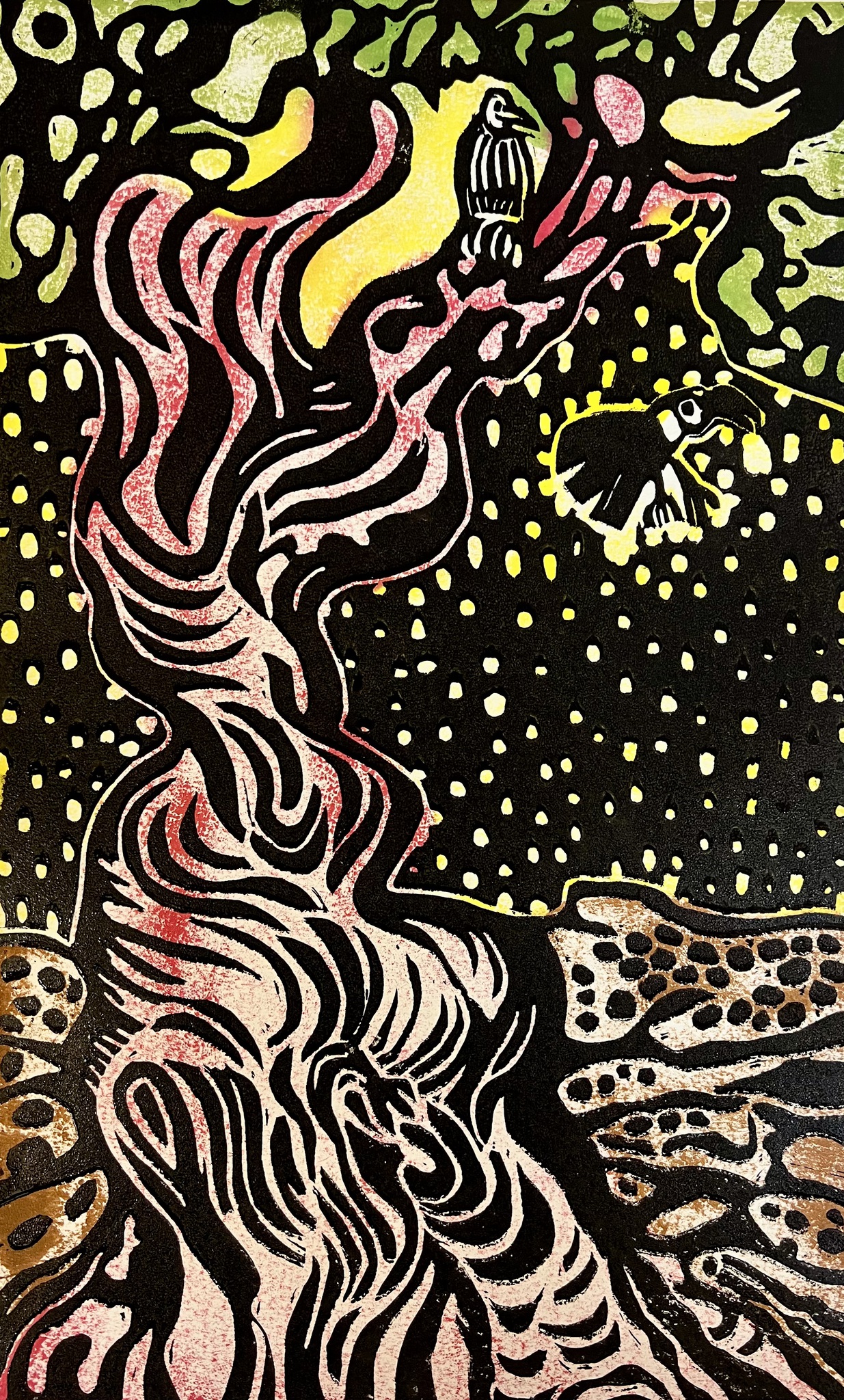 Deze linoleumsnede print is geinspireerd op een foto van een boom in het Schoorlse bos. De vogeltjes heb ik er in verwerkt omdat die altijd hoorbaar zijn. De kleuren zijn verkregen door eerst een afdruk van de linoplaat te maken met de kleuren die zichtbaar zijn. Daar overheen heb ik heb ik mijn linoleum uitsnede gedrukt. Tevens zijn er ook drukken in enkel; zwart wit.
