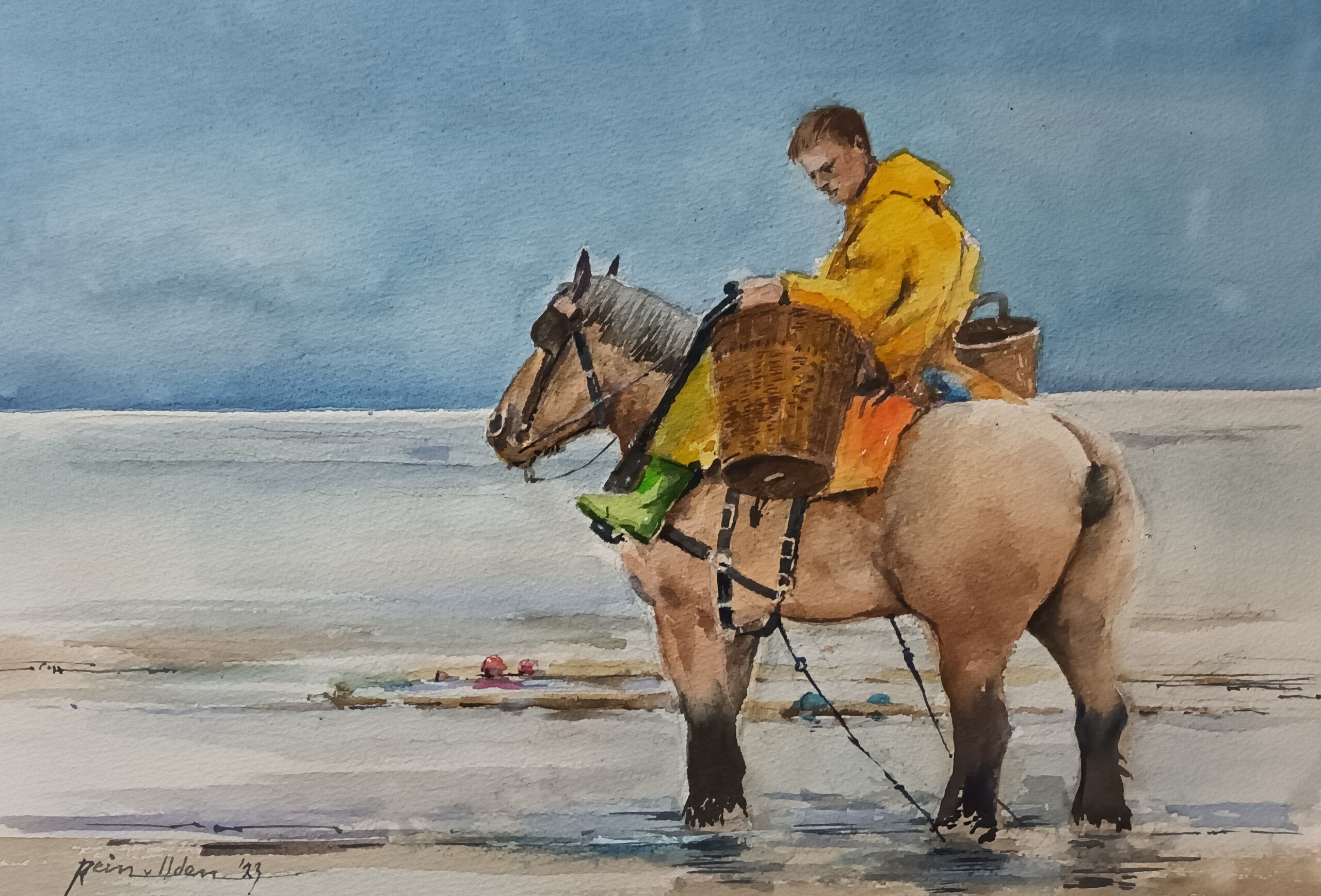 Aquarel van een garnalenvissen aan het strand van Oost Duinkerken
