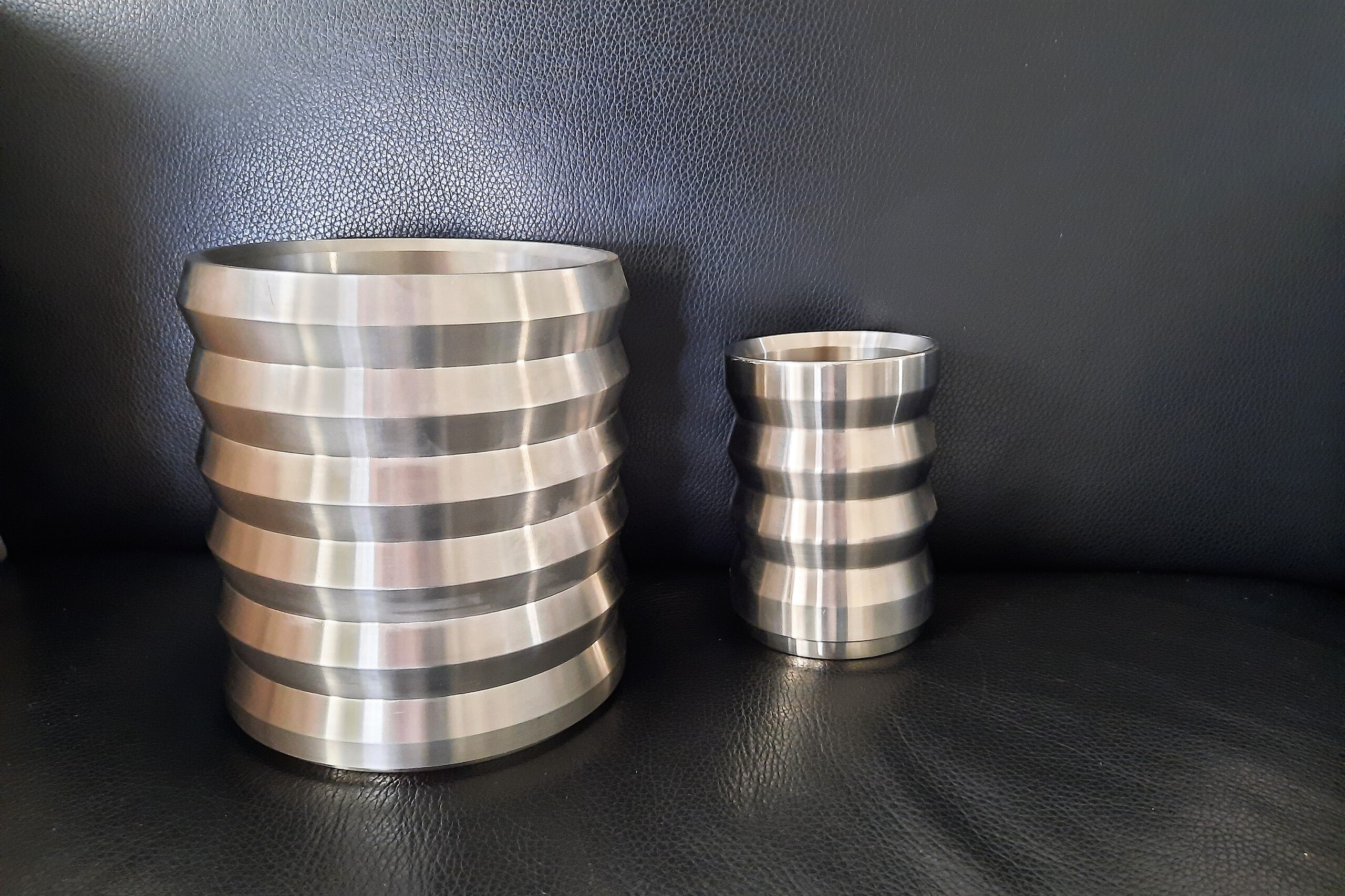 2 zwaar uitgevoerde rvs potten. 1 pot Ø 170x180 gew.8 kg en 1 pot Ø 100x130 gew.2 kg. Fraai bewerkt en zwaar uitgevoerd.