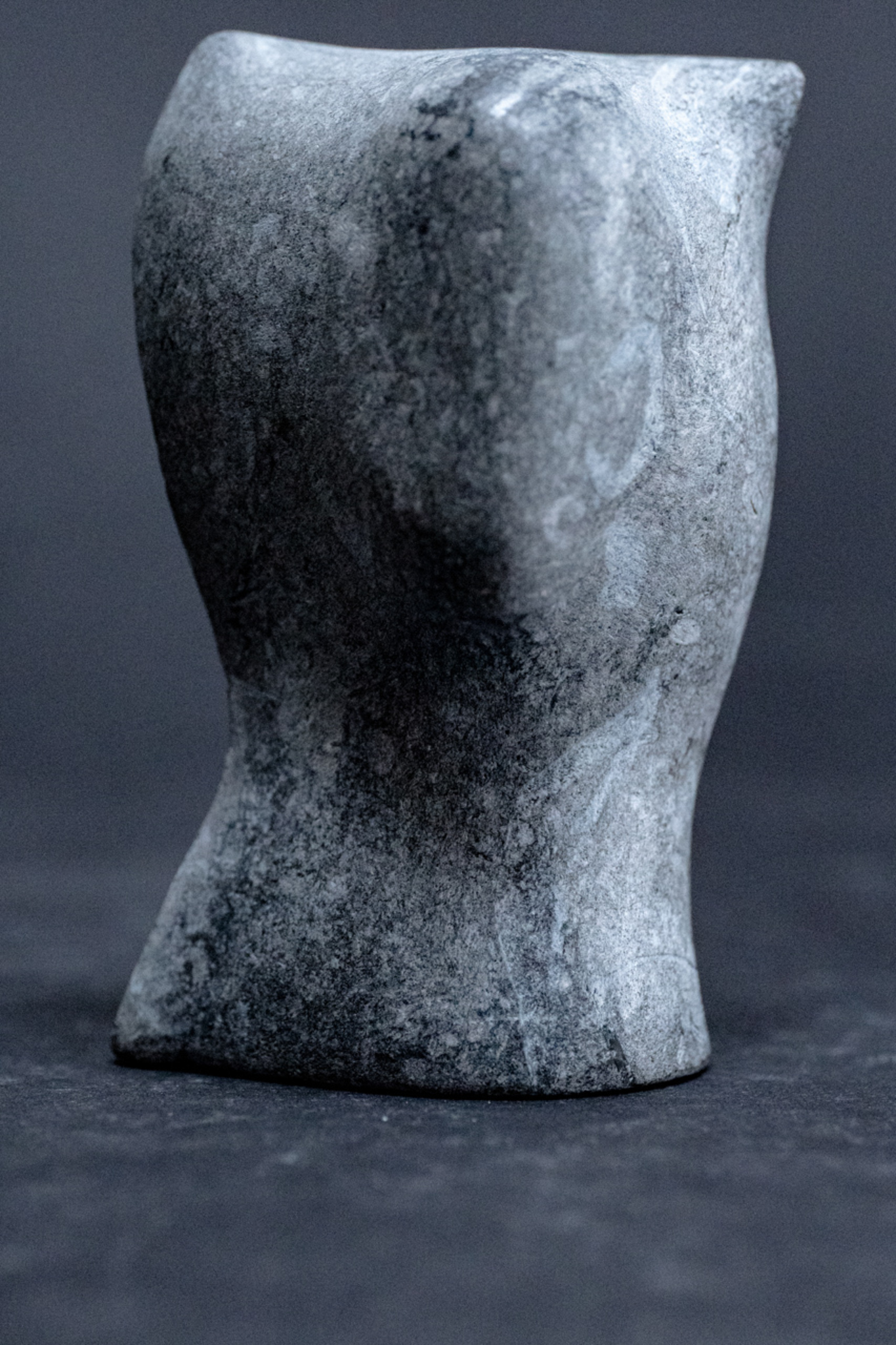Dit kleine beeldje is gemaakt van een reststukje hardsteen. In de vorm tekende zich een gezicht af, die vorm is gestileerd uitgewerkt.