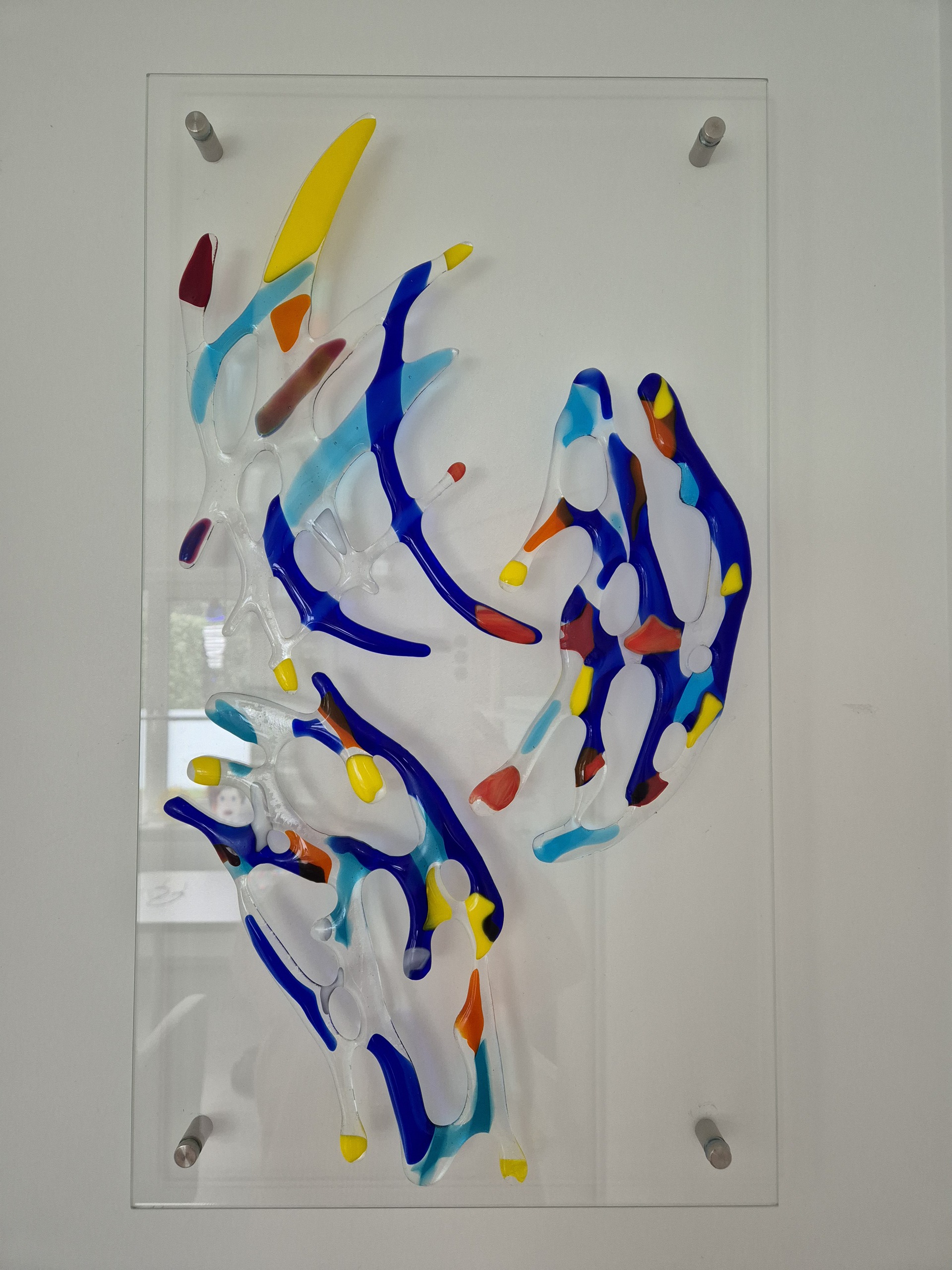 Blanke glasplaat met daarop gekleurd abstract werk