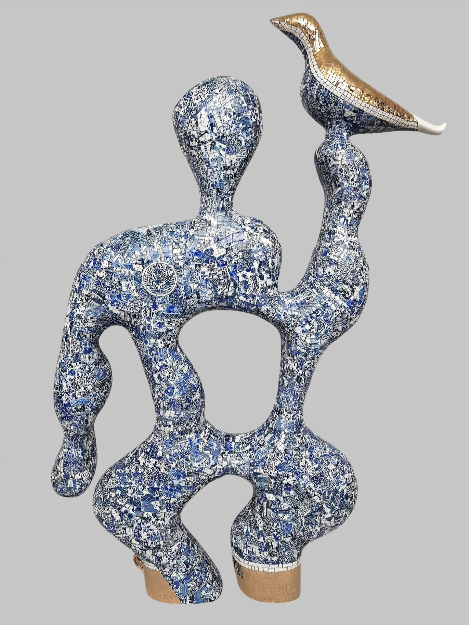 Opnieuw een porselein sculptuur VAN FORMAAT. Ja, hij is nl. 107 cm. hoog en 75 cm. breed. Deze sculptuur heeft geen specifieke voor- of achterkant. Dit keer een combinatie van blauw, wit en goud porselein. Deze sculptuur is NIET te koop.