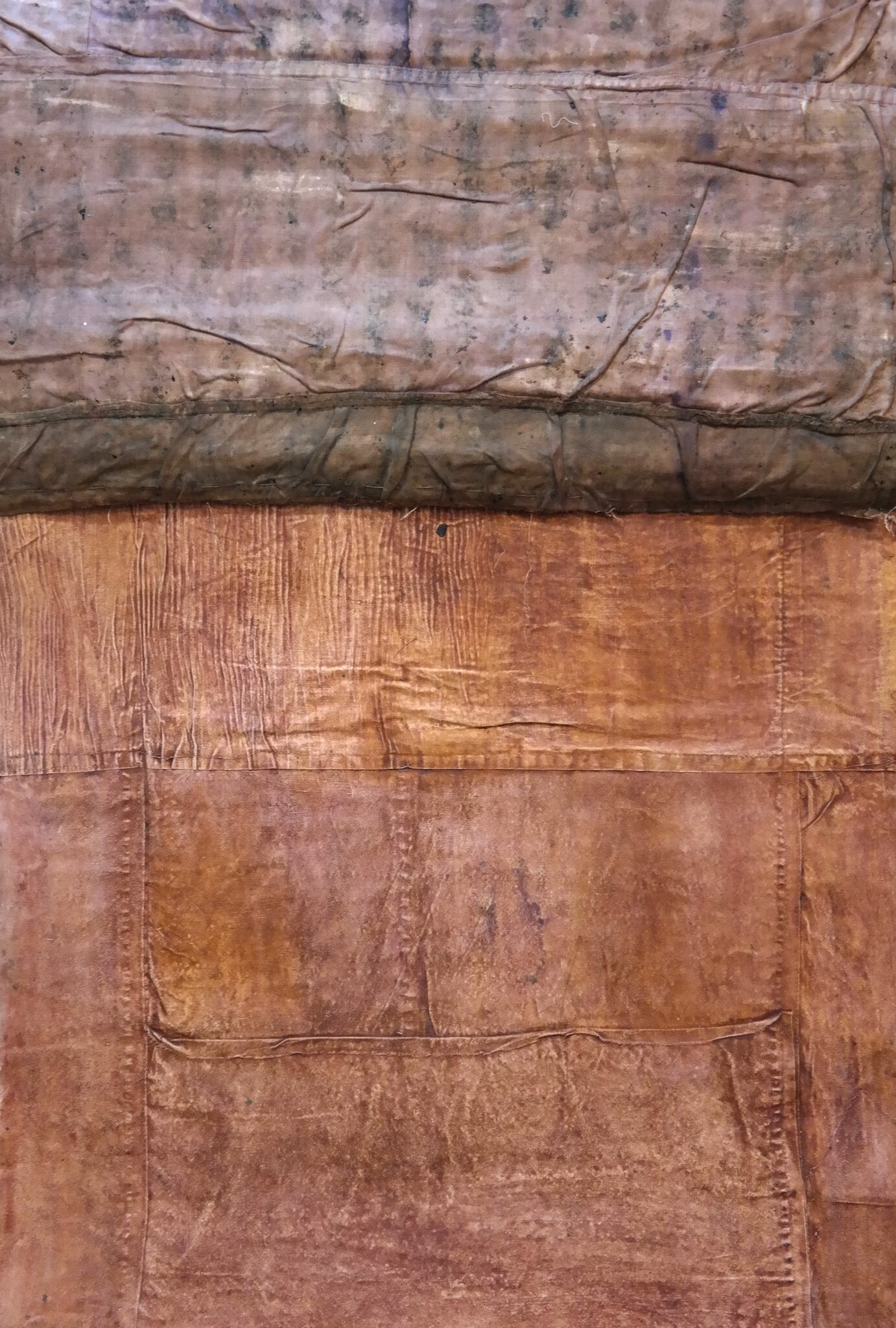 De ene kant van het werk bestaat uit stukken katoen, aaneengenaaid en gedrenkt in roestwater. De andere kant is beschilderd en heeft een stippenpatroon dat aangebracht is door middel van bramen.