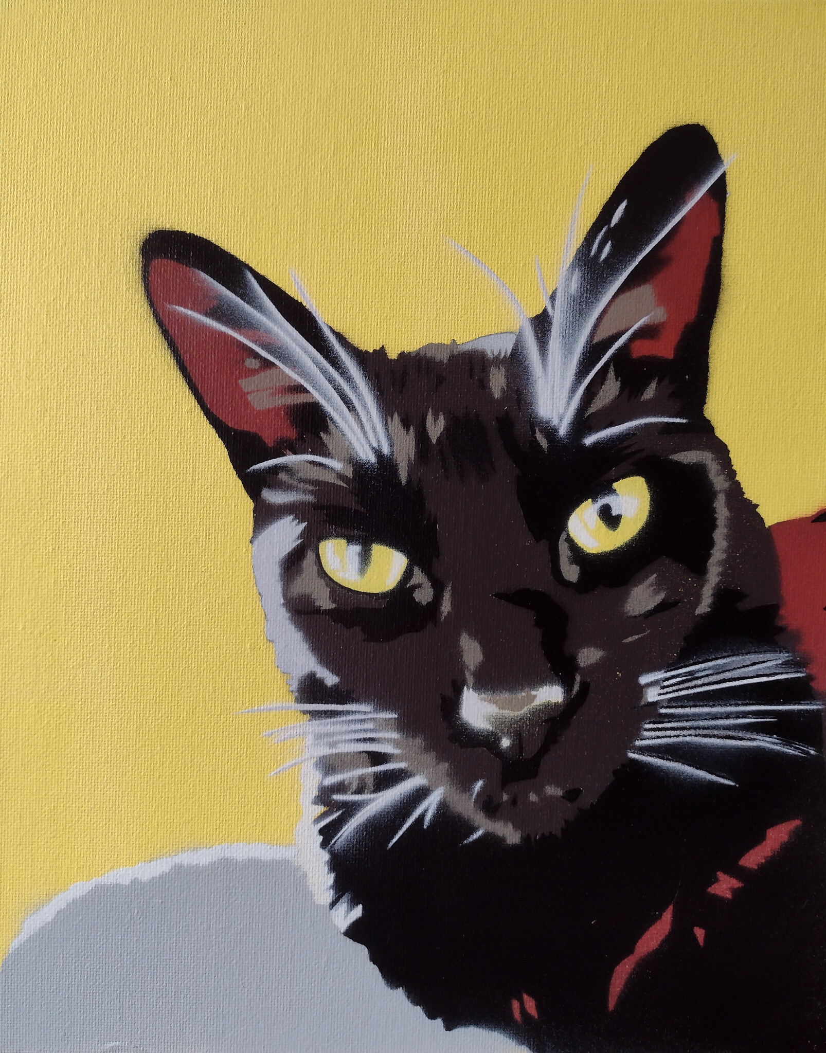 Spuitbus op paneel, gemaakt met handgesneden sjablonen.