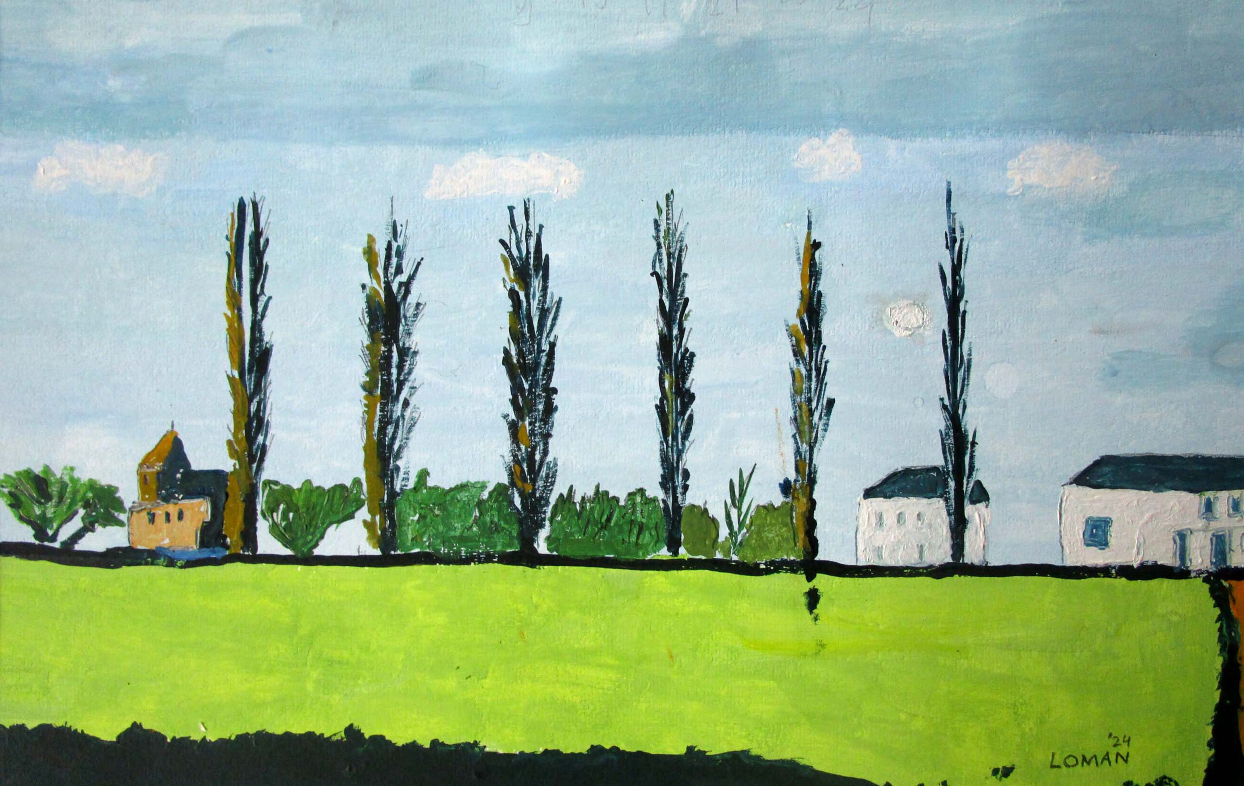 Karel Loman schildert expressief. Zijn landschappen en stads- en dorpsgezichten zet hij in heldere kleuren op papier. De sfeer van het landschap staat bij hem voorop. Loman werkt voornamelijk met temperaverf, aangevuld met inkt of potlood.