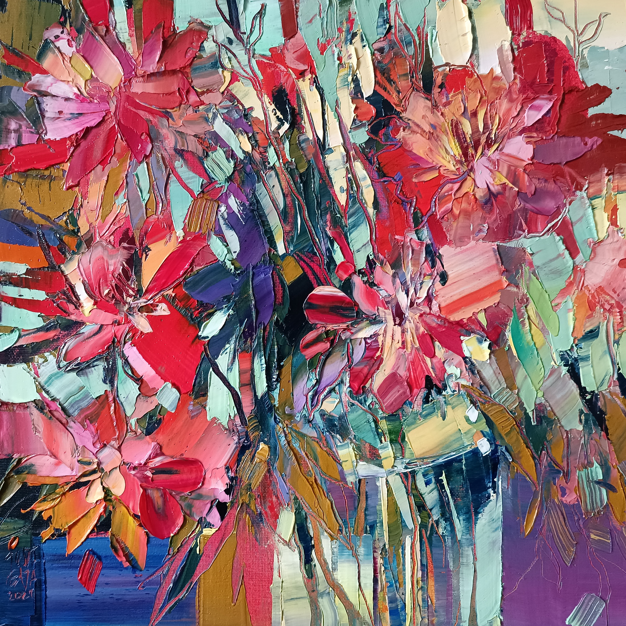 Geschilderd met paletmessen en pasteuze verf (impasto) in alla prima techniek. KLIK OP DE AFBEELDING VOOR EEN CLOSE-UP.
