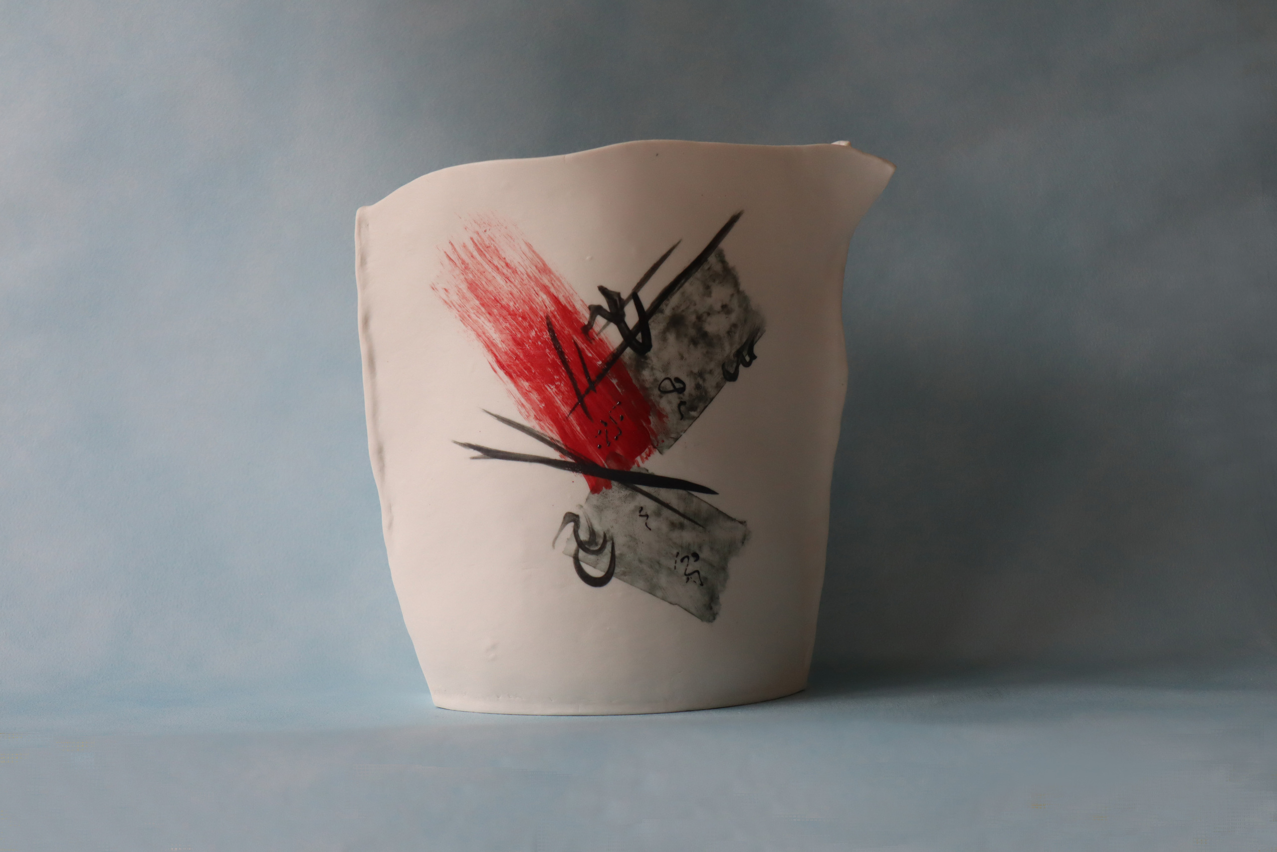 Deze pot is gemaakt van 2 plakken dunne klei. Voorzien van een eenvoudige zwart rode decoratie met onderglazuur. De binnenkant is voorzien van een glanzende transparante glazuur en daardoor waterdicht. Electrisch gestookt op 1260 ºC.