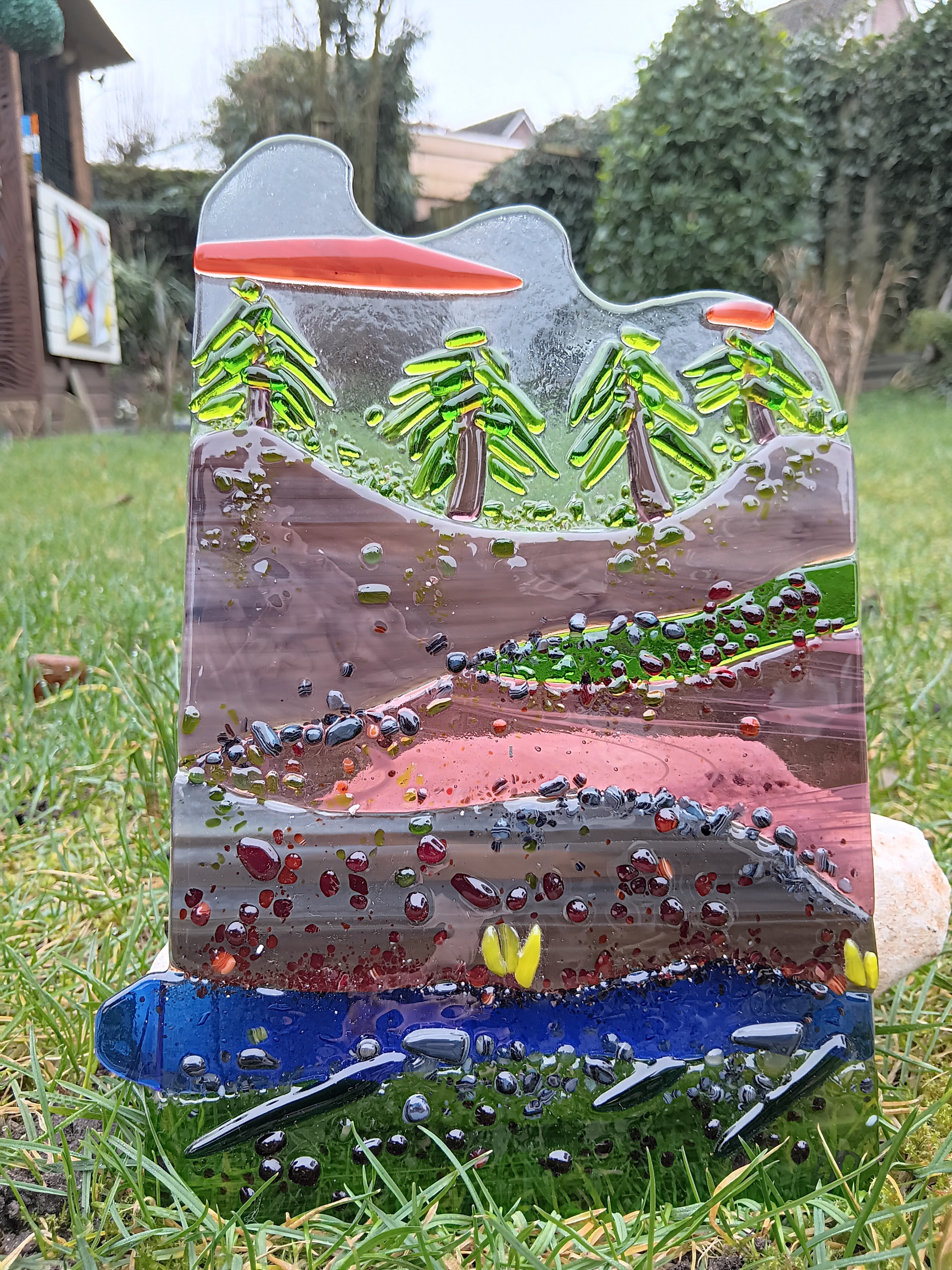 Glaswerk van Ed, diverse vormen en onderwerpen. Praktische expressie van onderwerpen in glas.