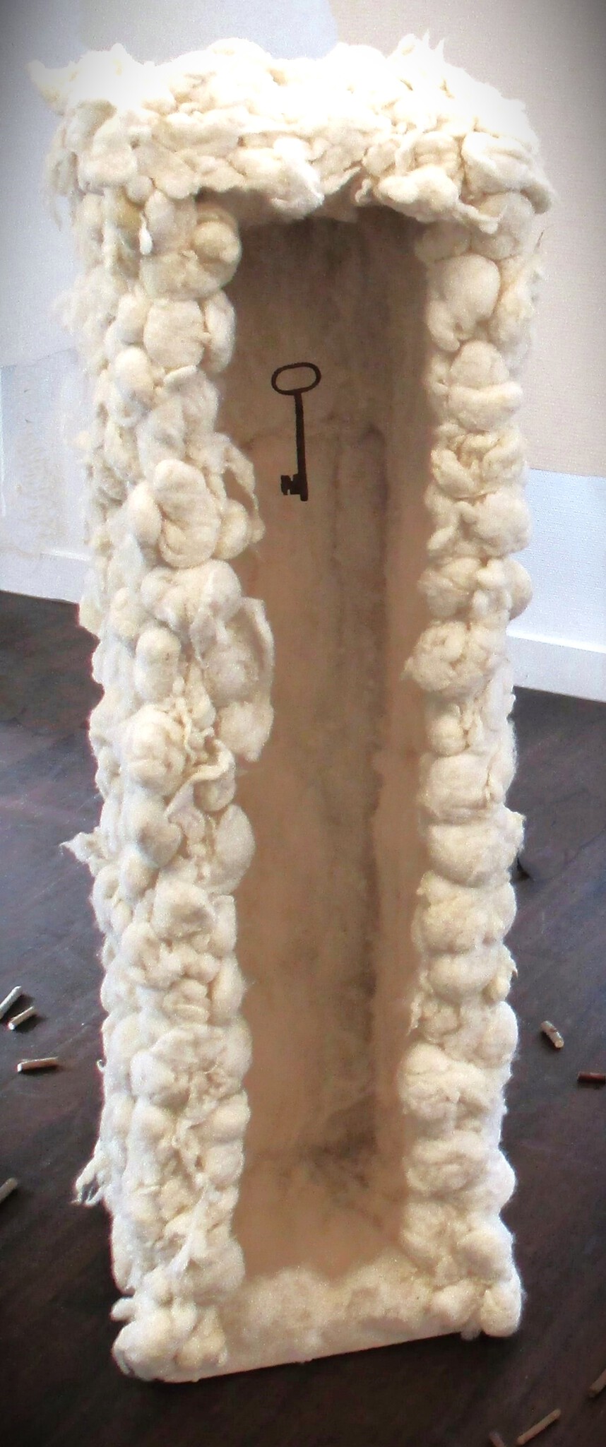 De Besloten Tuin is een inspirerend thema; de beslotenheid maakt vrije doorgang moeilijk. Dient de bescherming van deze “Besloten Tuin” van binnenuit of juist vanaf de buitenkant te worden bezien? Hoe gewenst of ongewenst is de beslotenheid? Sluit het degene die er naar binnen wil buiten? Of houdt het misschien degene die er binnen is gevangen? DE POORTWACHTER bergt een tegenstelling in zich. Een kleine ruimte van zacht tactiel materiaal met daarin hangend een oude verroeste sleutel. Waartoe geeft dit oude roestige object toegang? Het lijkt al onwaarschijnlijk lang niet meer gebruikt. Het contrast is groot tussen de zachtheid van de ruimte opgebouwd uit schapenwol, en de hardheid van de verroeste metalen sleutel. Wordt de aanblik van die zachte ruimte ‘verhard’ door het koude metaal? Of werkt het juist omgekeerd; wordt het harde metaal van de sleutel ‘verzacht’ door het zachte materiaal van de omgevende ruimte? En wat zegt dit over de ‘Besloten Tuin’ waartoe deze sleutel toegang zou kunnen geven?