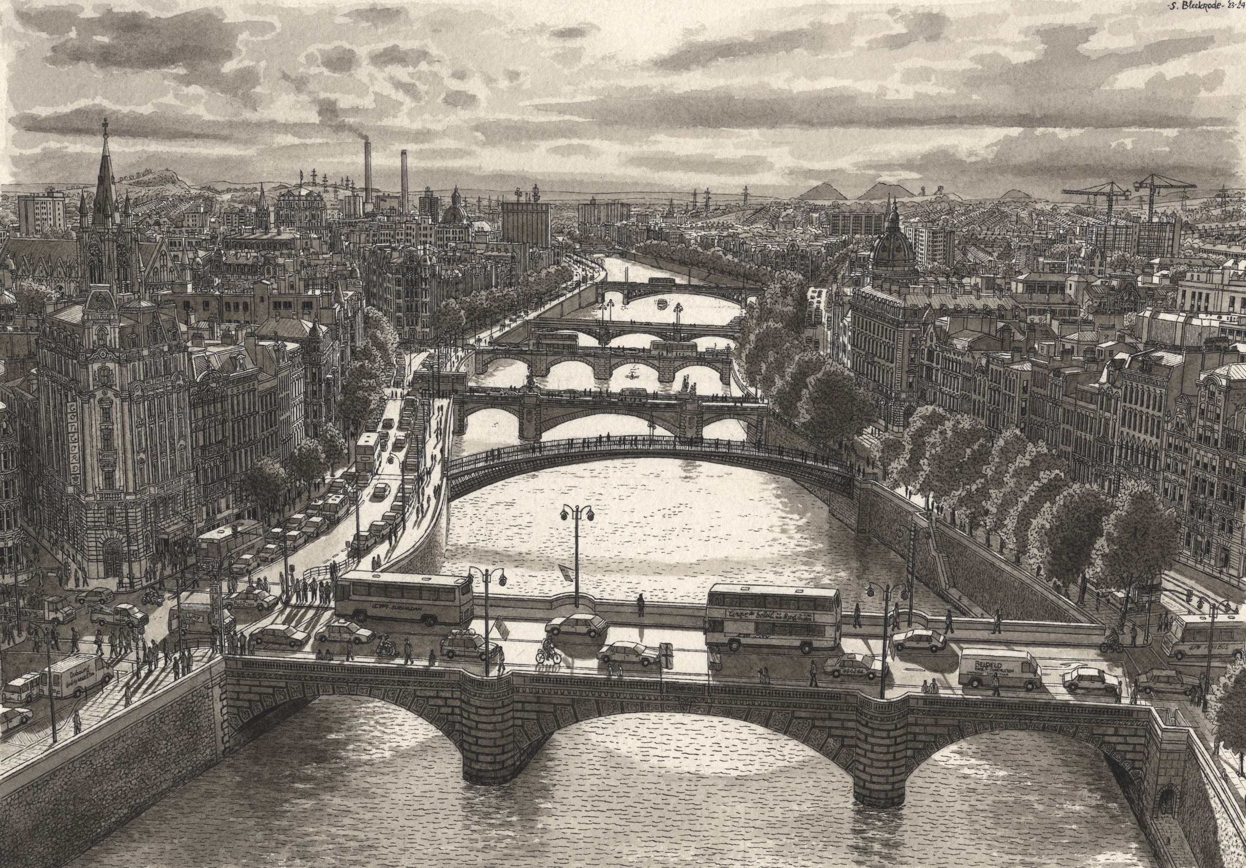 Stad City Tekening Drawing Kunst Art Rivier River Architectuur Architecture Inkt Ink Aquarel Watercolor Mensen People Verkeer Traffic Zon Sun Urban
