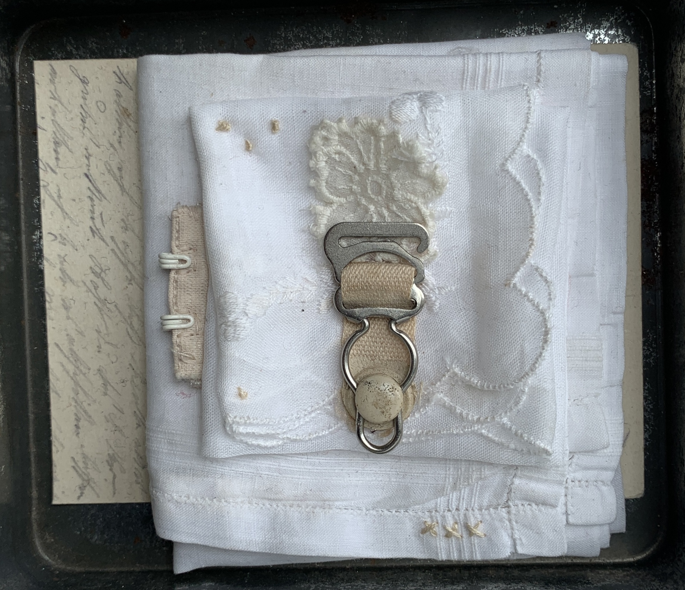 Collage van mixed media: vintage ansichtkaart, zakdoekjes, jarretel, haakjes, kan, garen. Gelijmd en genaaid