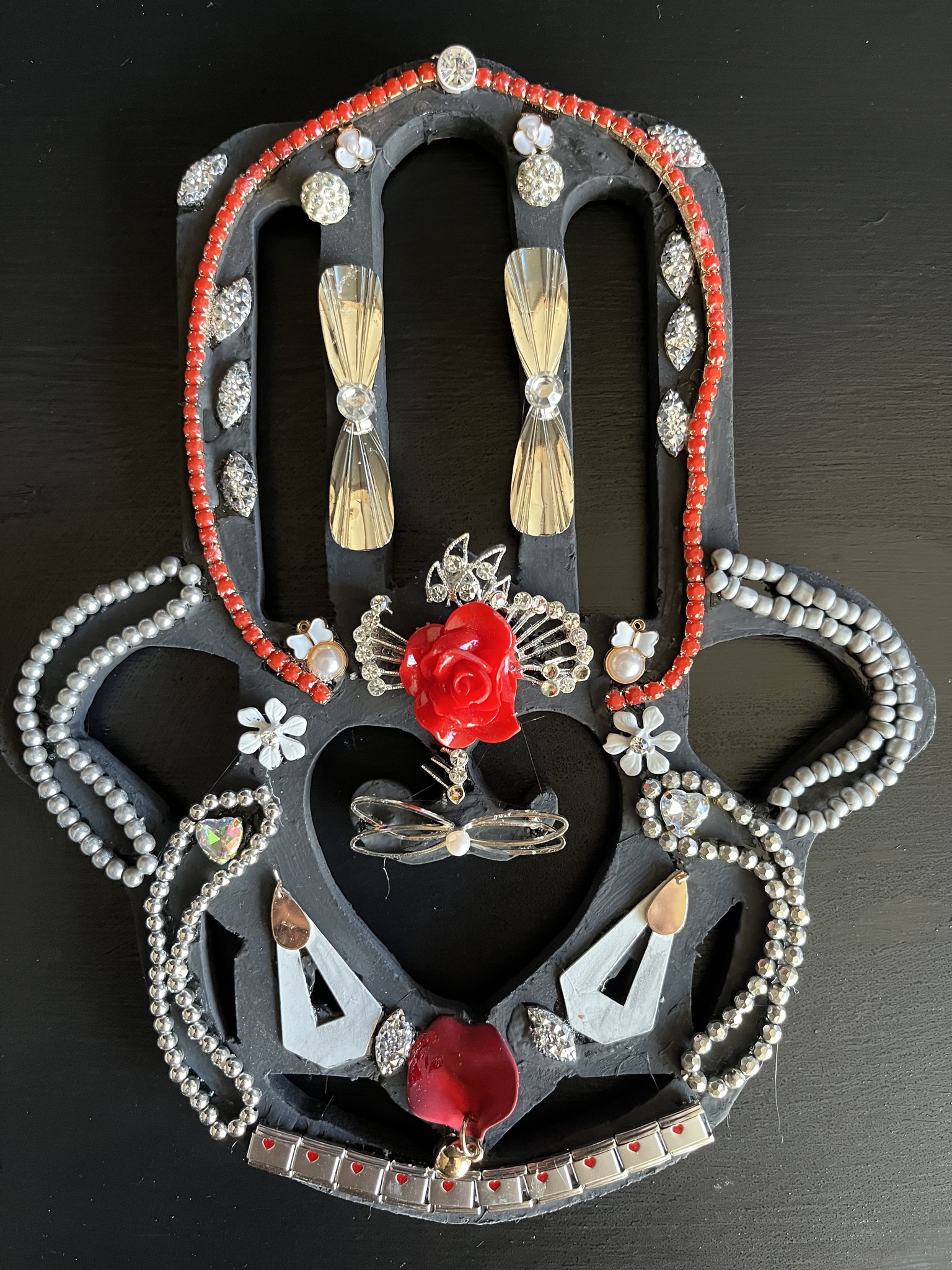 Hand van Fatima / Khamsa bewerkt met rode en zilveren sieraden.