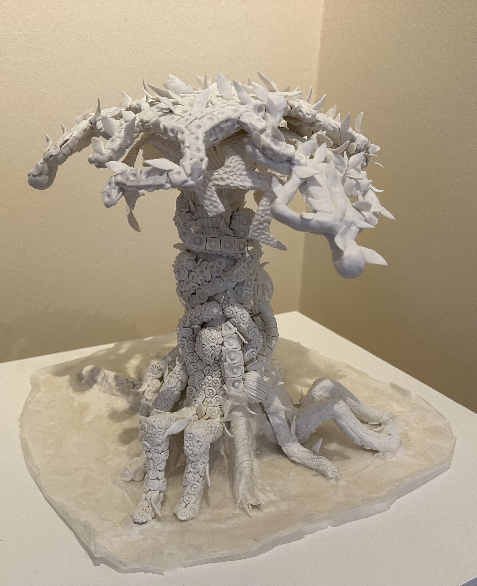 porseleinen boom, aangevuld met chinees rijstpapier, bestaande uit allerlei vervlochten mensfiguren met diverse structuren ik zie vaak mensfiguren in bomen