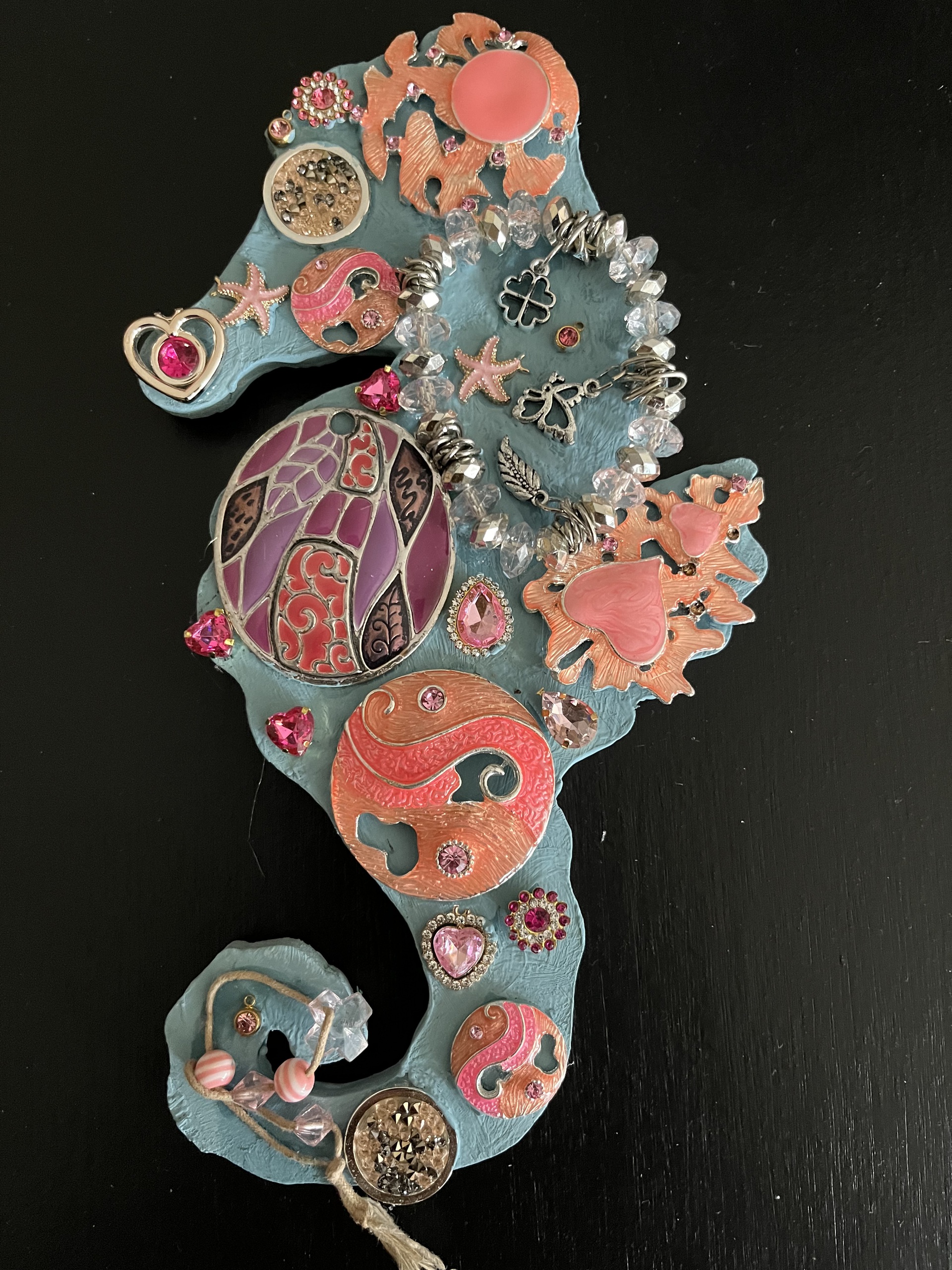 Zeepaard op blauw houten ondergrond. Bewerkt met roze sieraden.