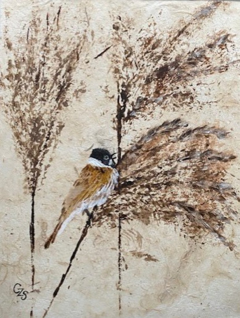 Rietgors in acryl en inkt op grof rijstpapier in zwarte passe partout en blank houten lijst Verkocht