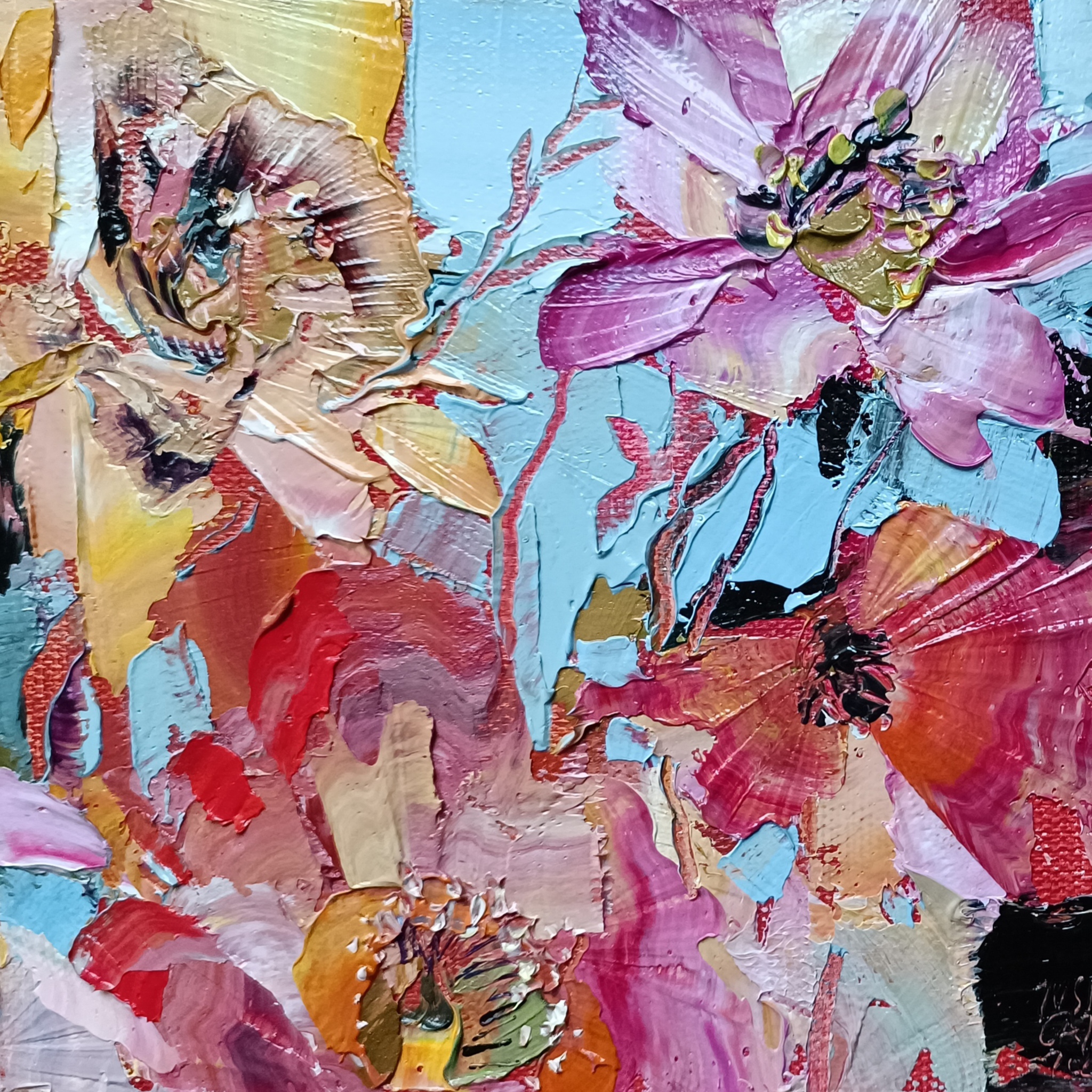 Schilderij Abstract Bloemen Klein Hout Art Kleurrijk Olieverf Kunst Painting New Galerie Stilleven Flower Still Life Flowers Paletmes Impression Miniatuur Panel Floral Knife Bold Impasto