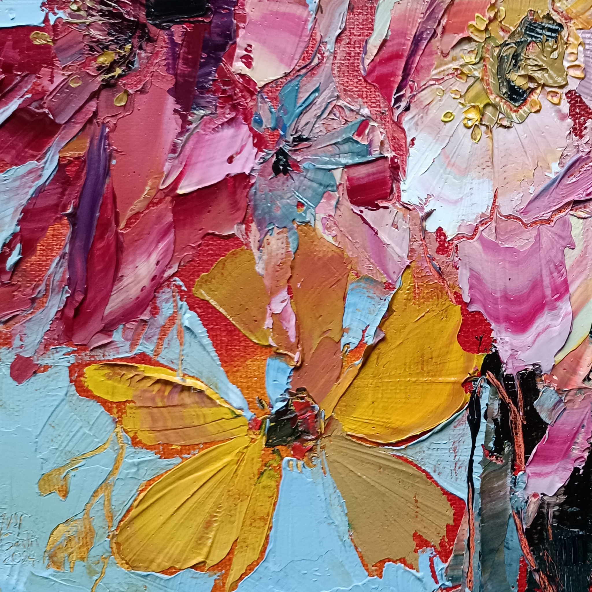 Geschilderd met paletmessen en pasteuze verf (impasto) in alla prima techniek. KLIK OP DE AFBEELDING VOOR EEN CLOSE-UP.