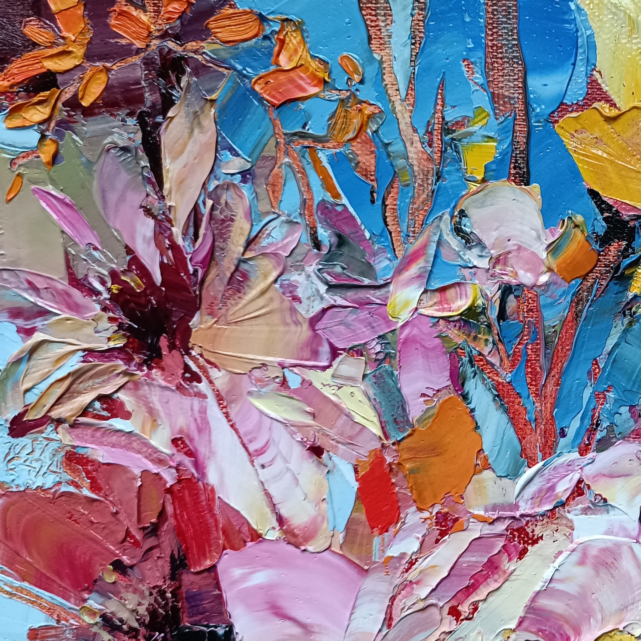Geschilderd met paletmessen en pasteuze verf (impasto) in alla prima techniek. KLIK OP DE AFBEELDING VOOR EEN CLOSE-UP.