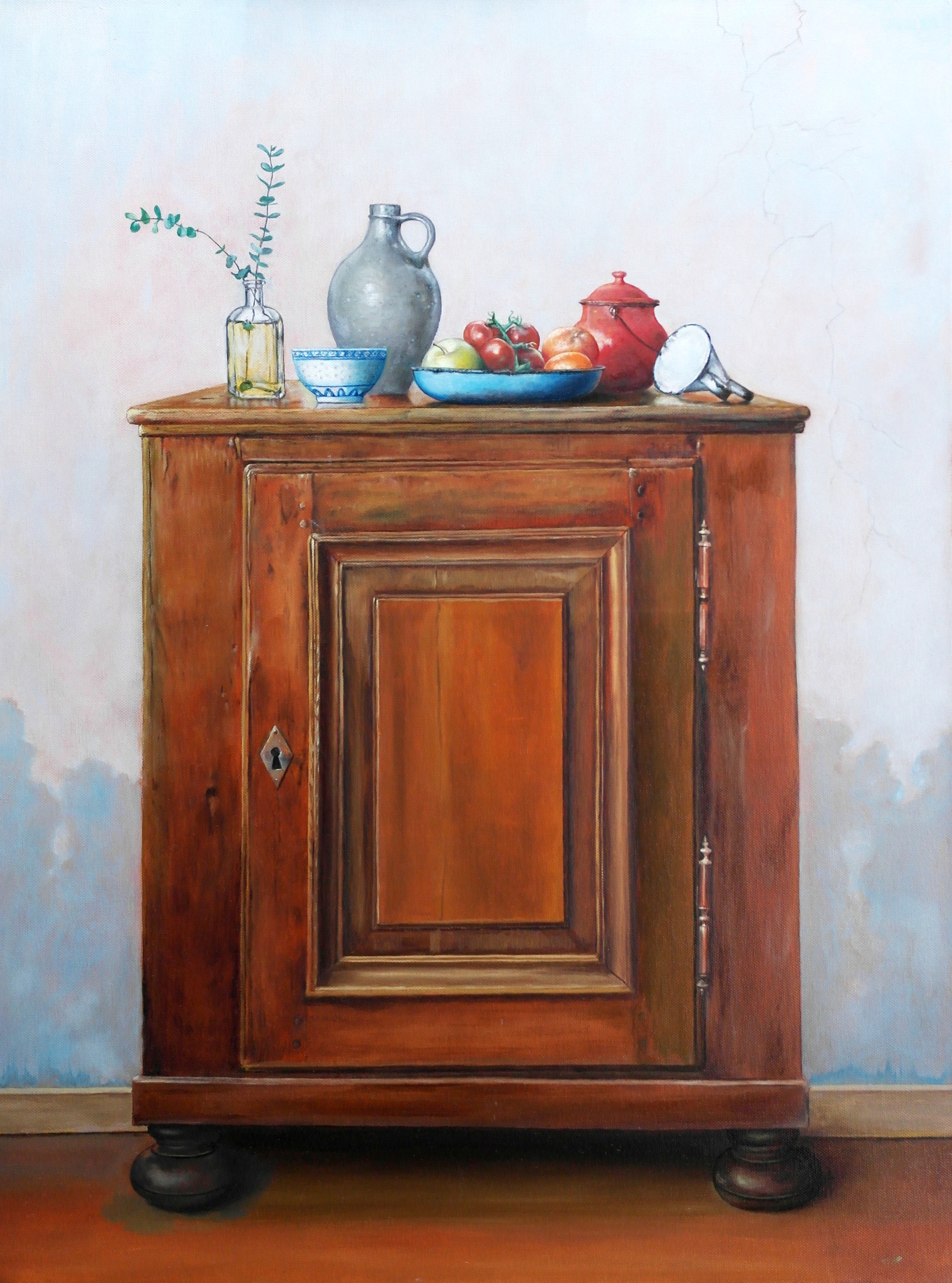 Op dit kastje componeer ik de meeste stillevens zoals ook dit maar nu met het kastje erbij.