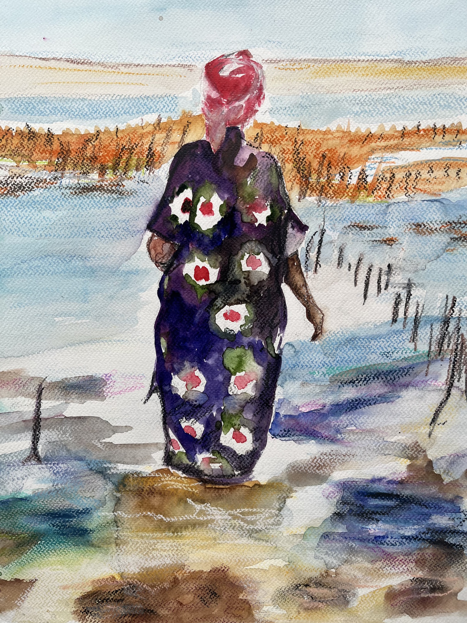 Woman wading through ankle-deep water