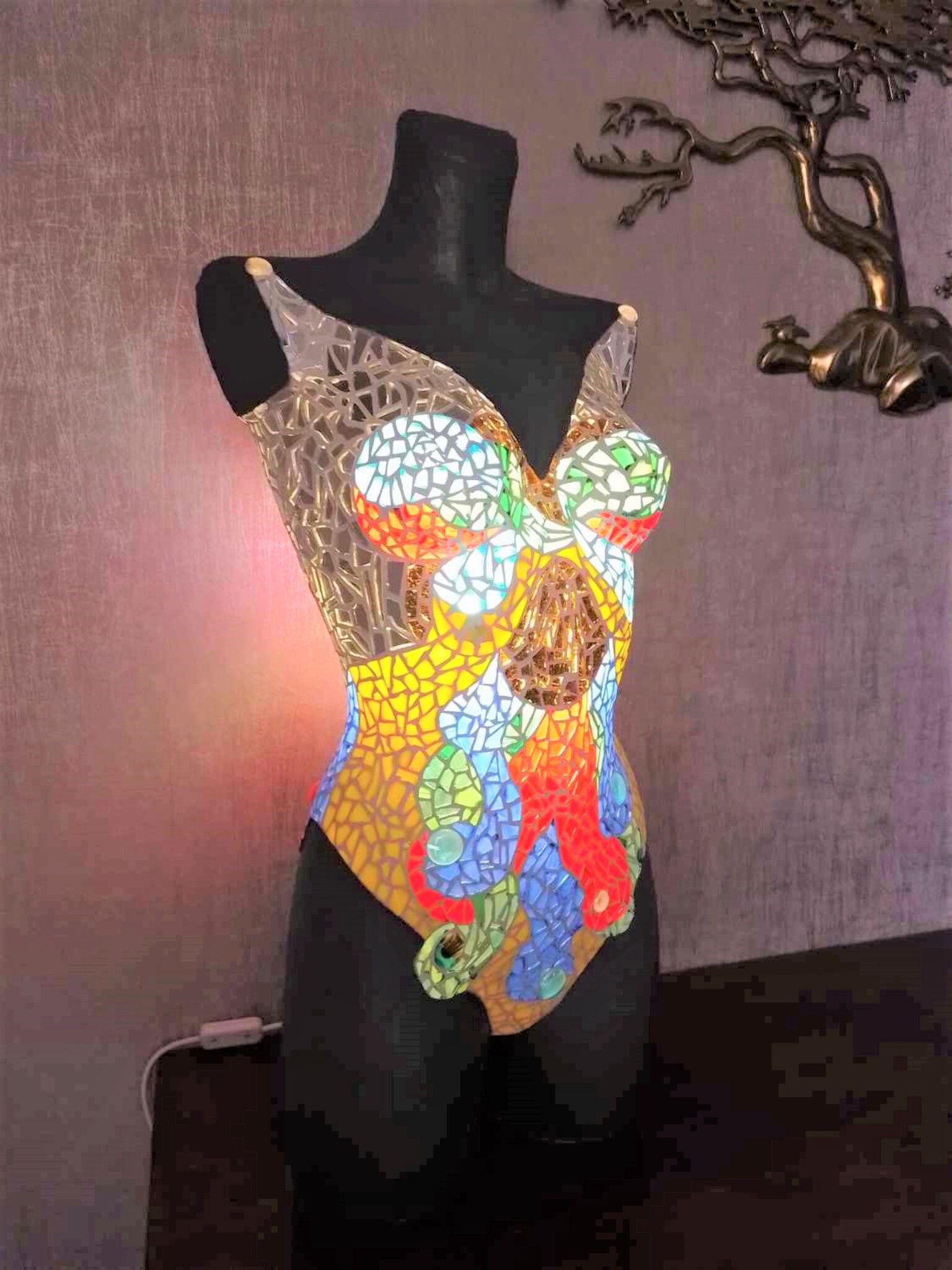 Mannequin torso bekleed met spiegelmozaïek en gekleurd tiffany glas. Verlichting zit in de torso waardoor je in de avond een prachtig sfeevol lichteffect hebt.
