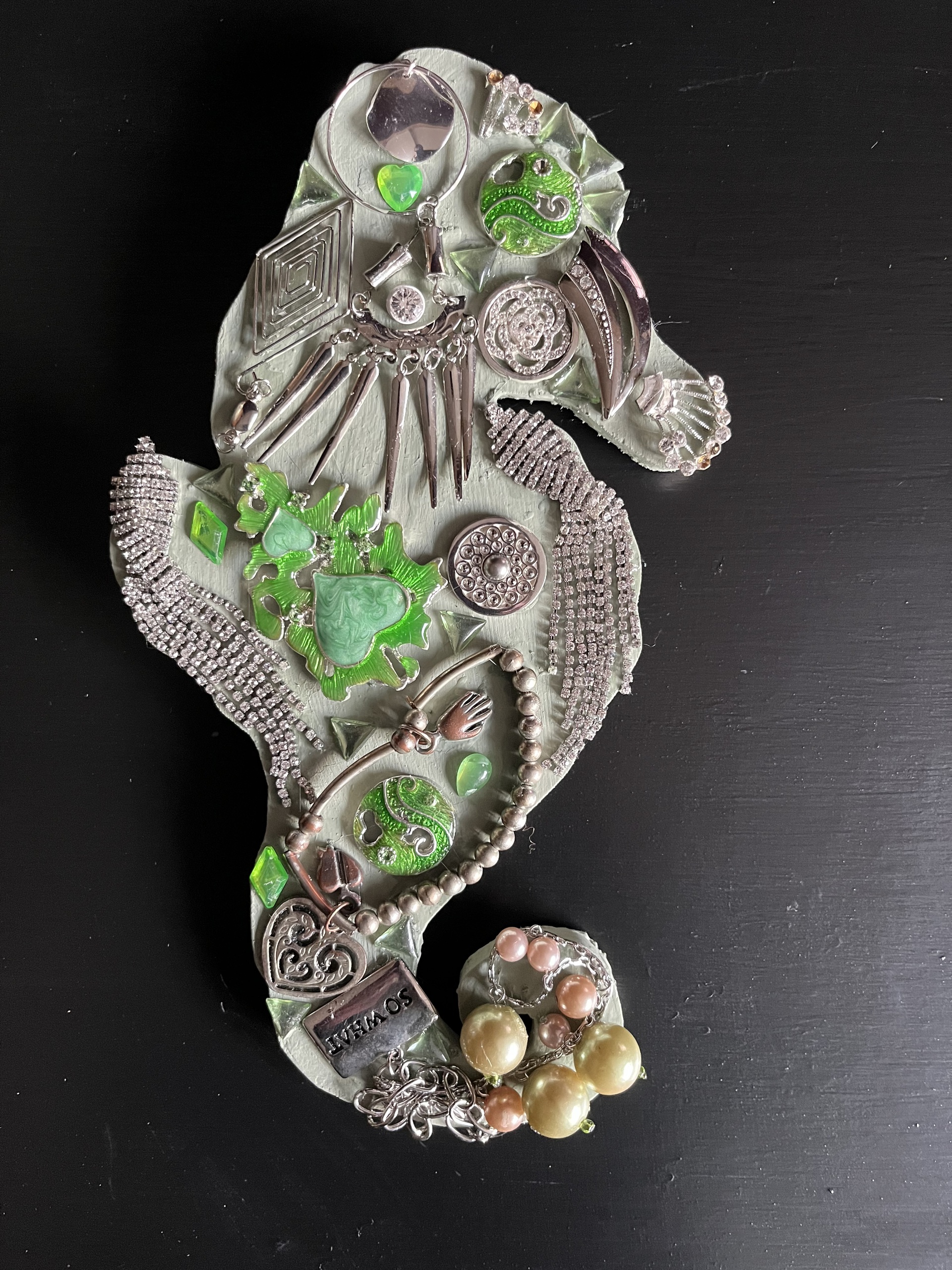 Zeepaard op groen houten ondergrond. Bewerkt met groen en zilveren sieraden.