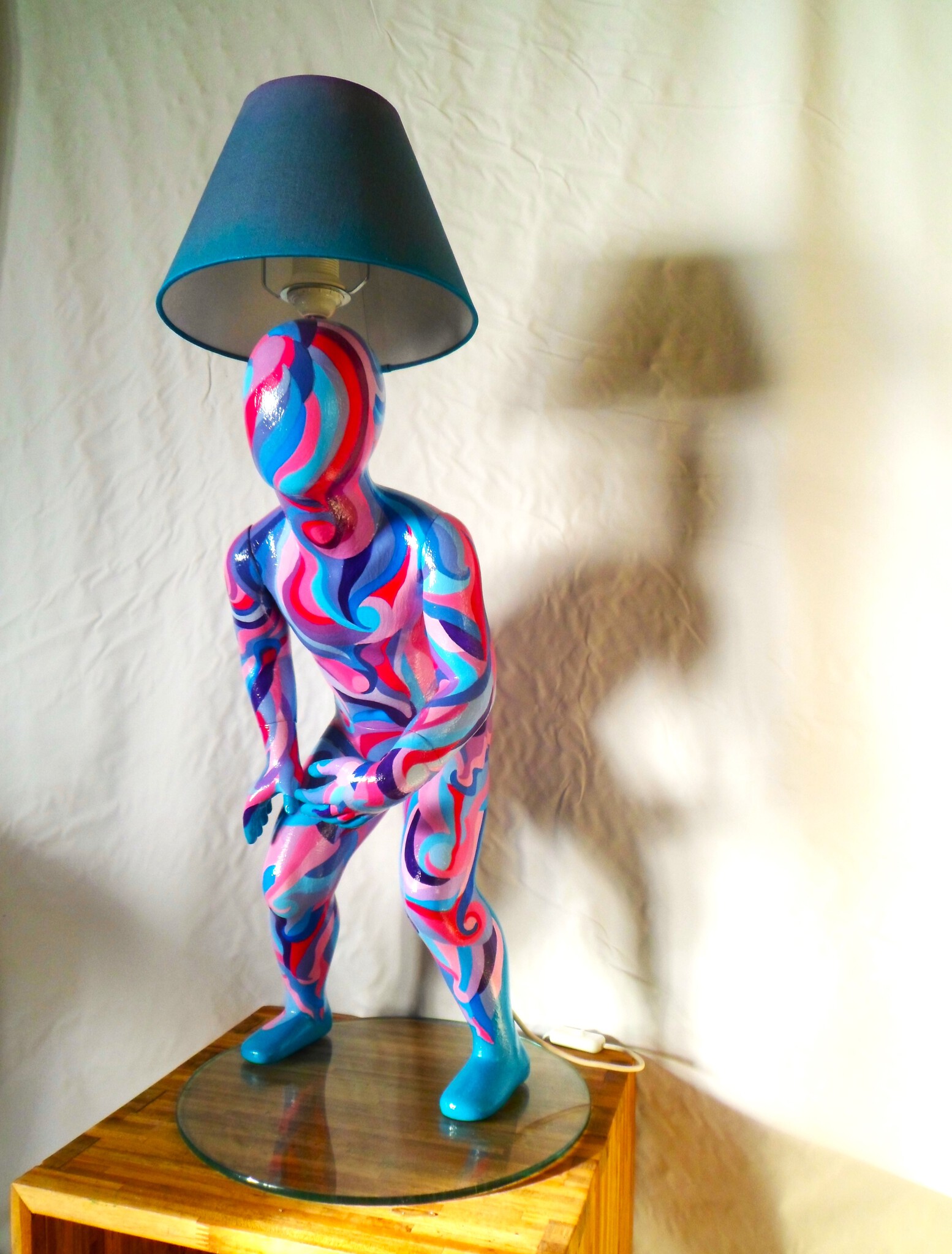 Klein etalagepopje, beschilderd met acrylatverf met bijpassende lampenkap