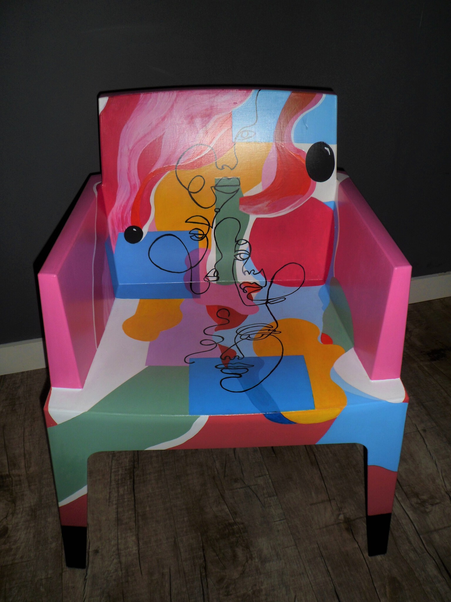 Kunsstof stoel geheel beschilderd met acrylaatverf