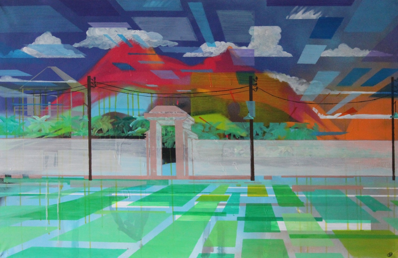 Bas de Boer (1973) / Alkmaar Gedreven om te creëren pakt hij na zijn studie aan de kunstacademie (AKI) de kwast weer op. Liefde voor graffiti brengt hem naar een workshop (Steve Locatelli)met ‘spraycans’. Het strakke en snelle werken met een ‘spraycan’ combineert heerlijk met de lome en soms druipende waterige acryl. Op het doek ontstaan kleurrijke interpretaties van stedelijke en industriële landschappen met architectuur en perspectief.