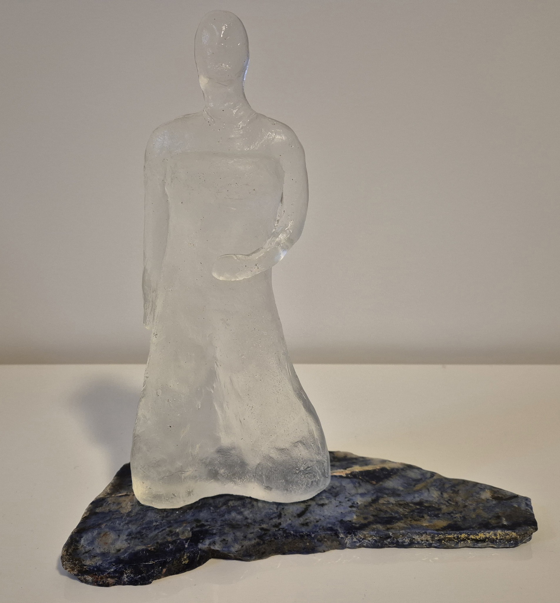 Vrouw in gala kleding bevestigd op sodaliet steen. Afmeting steen 25x10