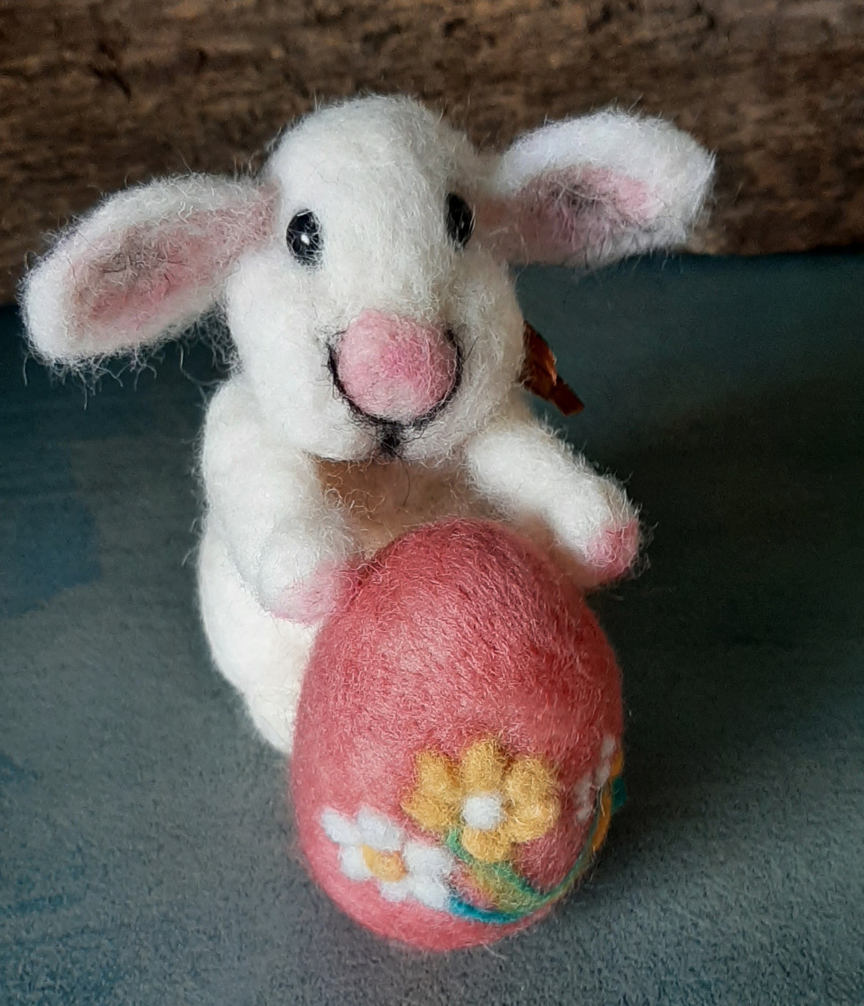 Konijntje met ei genaaldvilt. Afmeting konijntje 11cm hoog en 5,5cm breed Afmeting ei 7cm hoog en 4,5cm breed