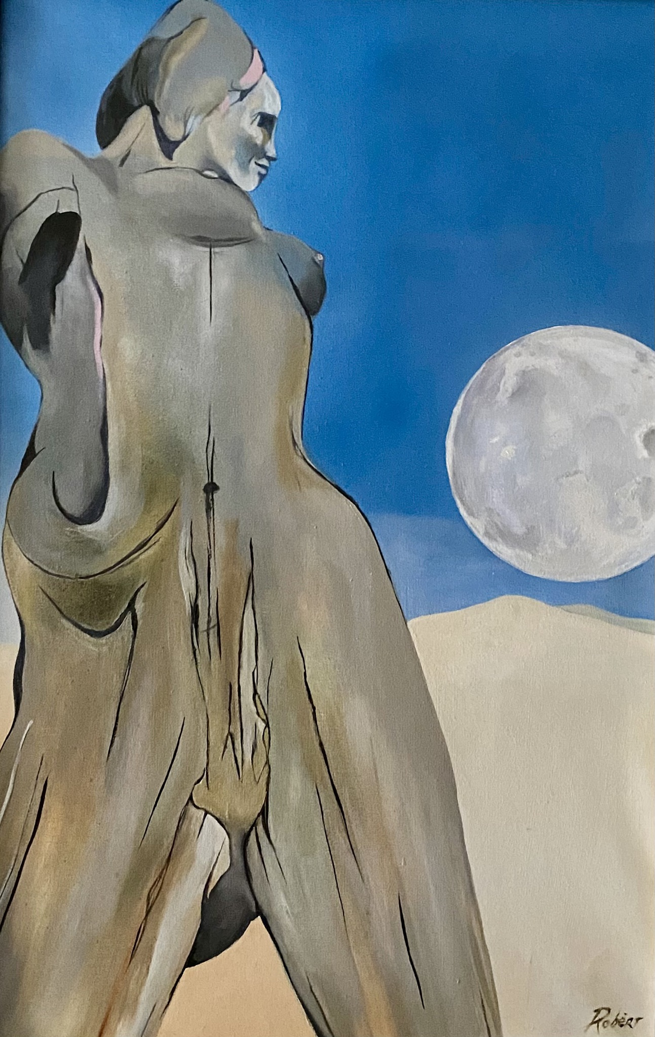 Gebaseerd op een houten standbeeld van een vrouw. Verbeeldt de klimaatverandering. Het werk is compleet met lijst.