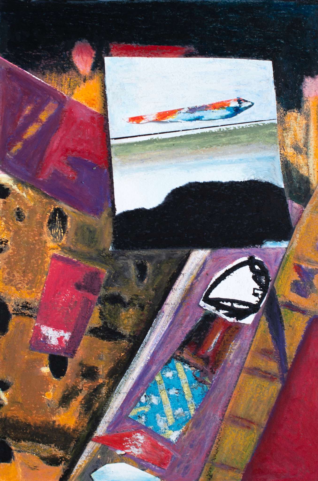Eerst heb ik een collage gemaakt van papier. Toen bedacht ik dat het interessant zou zijn om de collage met oliepastel te tekenen. Het verrassende resultaat is vervreemdend. Materiaal/discipline Oilpastel on print of my collage