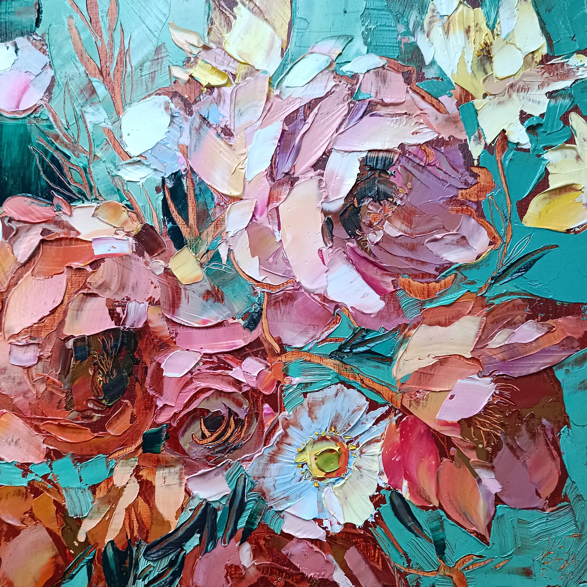 Schilderij Abstract Rood Blauw Bloemen Klein Art Kleurrijk Olieverf Kunst Painting New Galerie Red Stilleven Flower Still Life Flowers Paletmes Impression Turqoise Panel Floral Knife