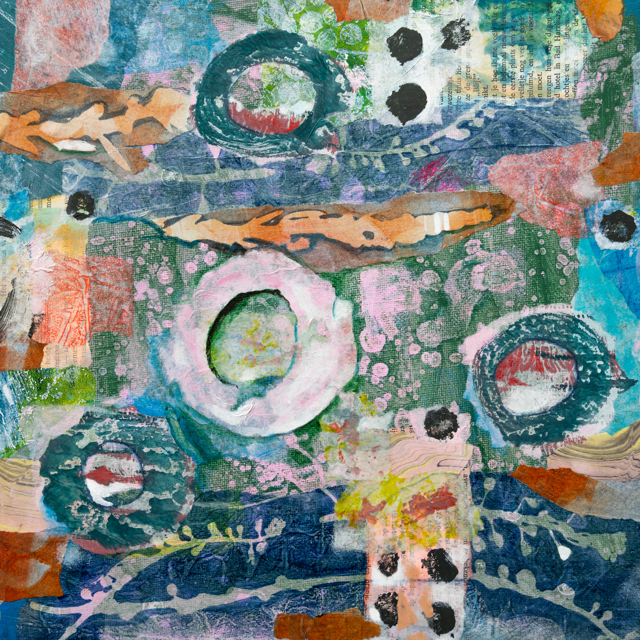 Ik maak schilderijen met acrylverf op canvas en papier. Ook gebruik ik collage. De laatste tijd experimenteer ik met fotografie.