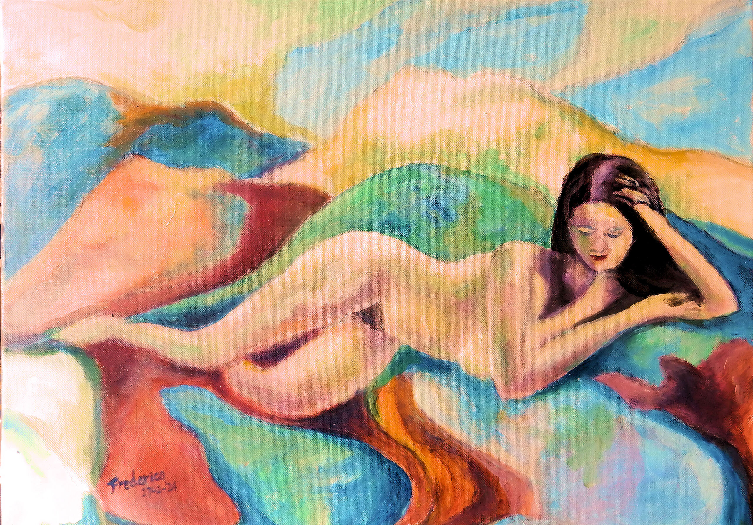 liggende naakte vrouw in acrylverf geschilderd in abstracte stijl