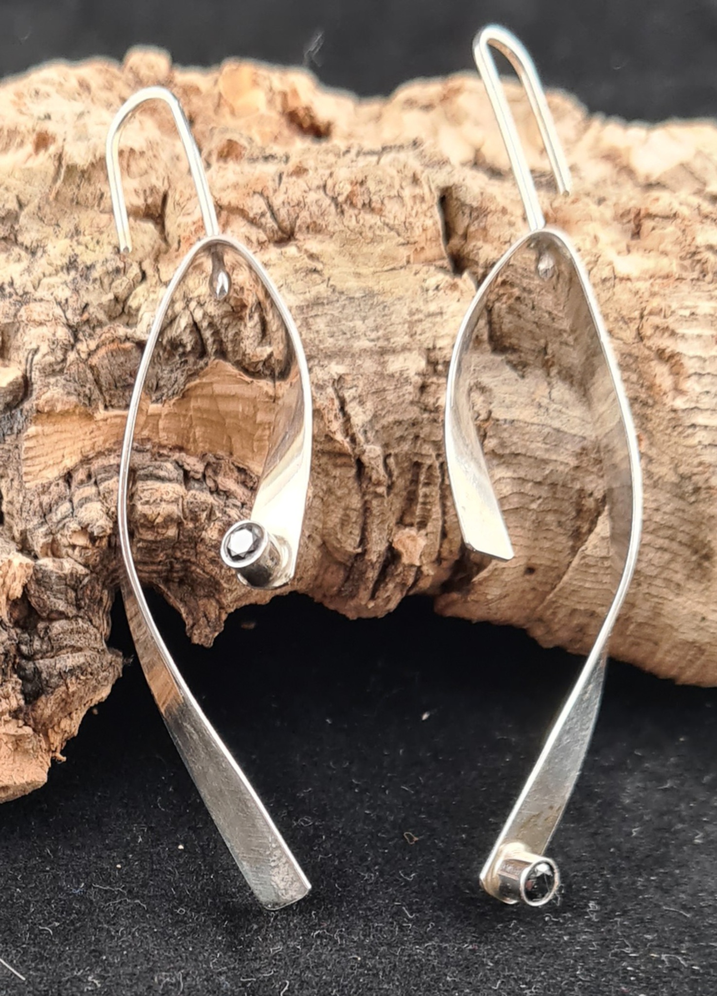 zilveren oorhangers, gedraaid zilveren strip met zikonia's