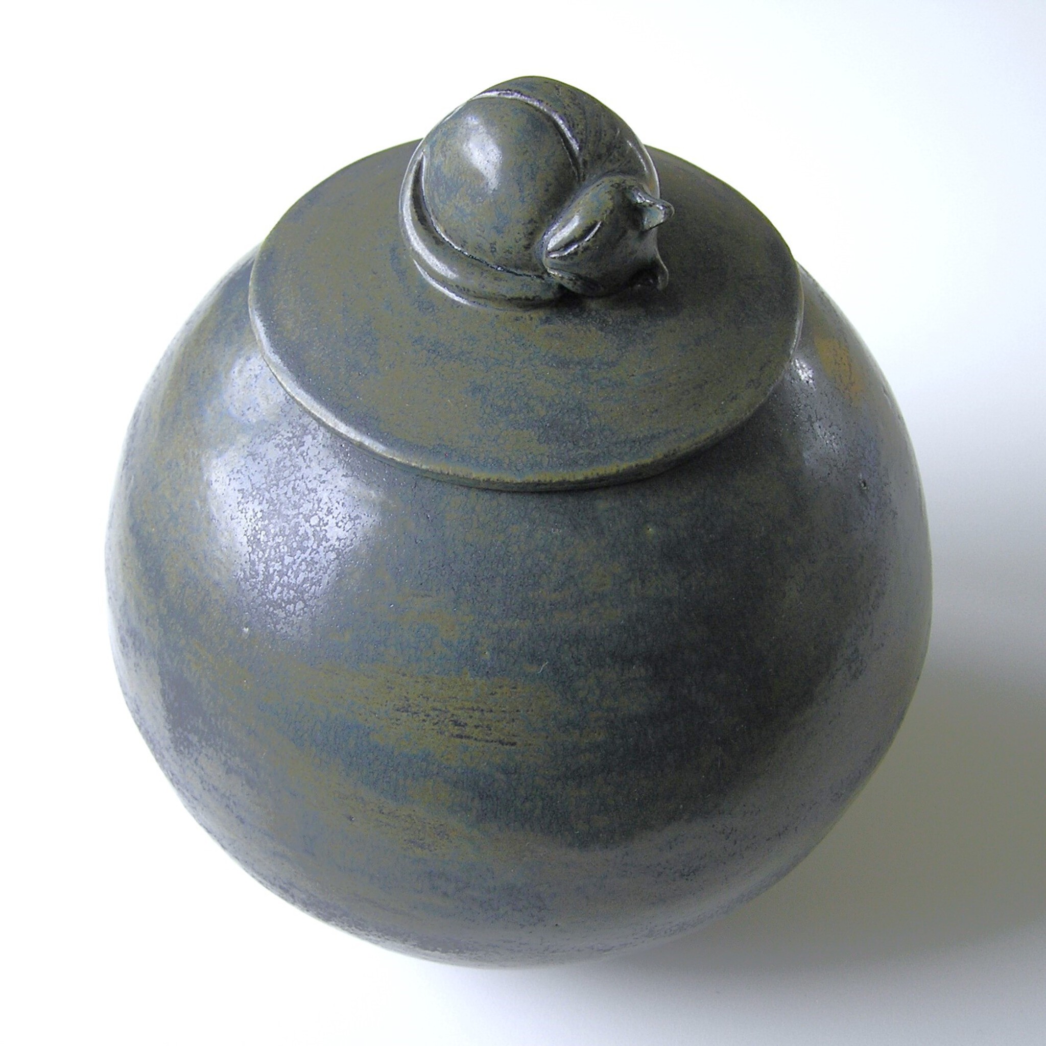 Bol, met de hand opgebouwd, biscuit gestookt en vervolgens in meerdere donkere kleuren geglazuurd. Op het deksel is een knop bevestigd in de vorm van een kat.