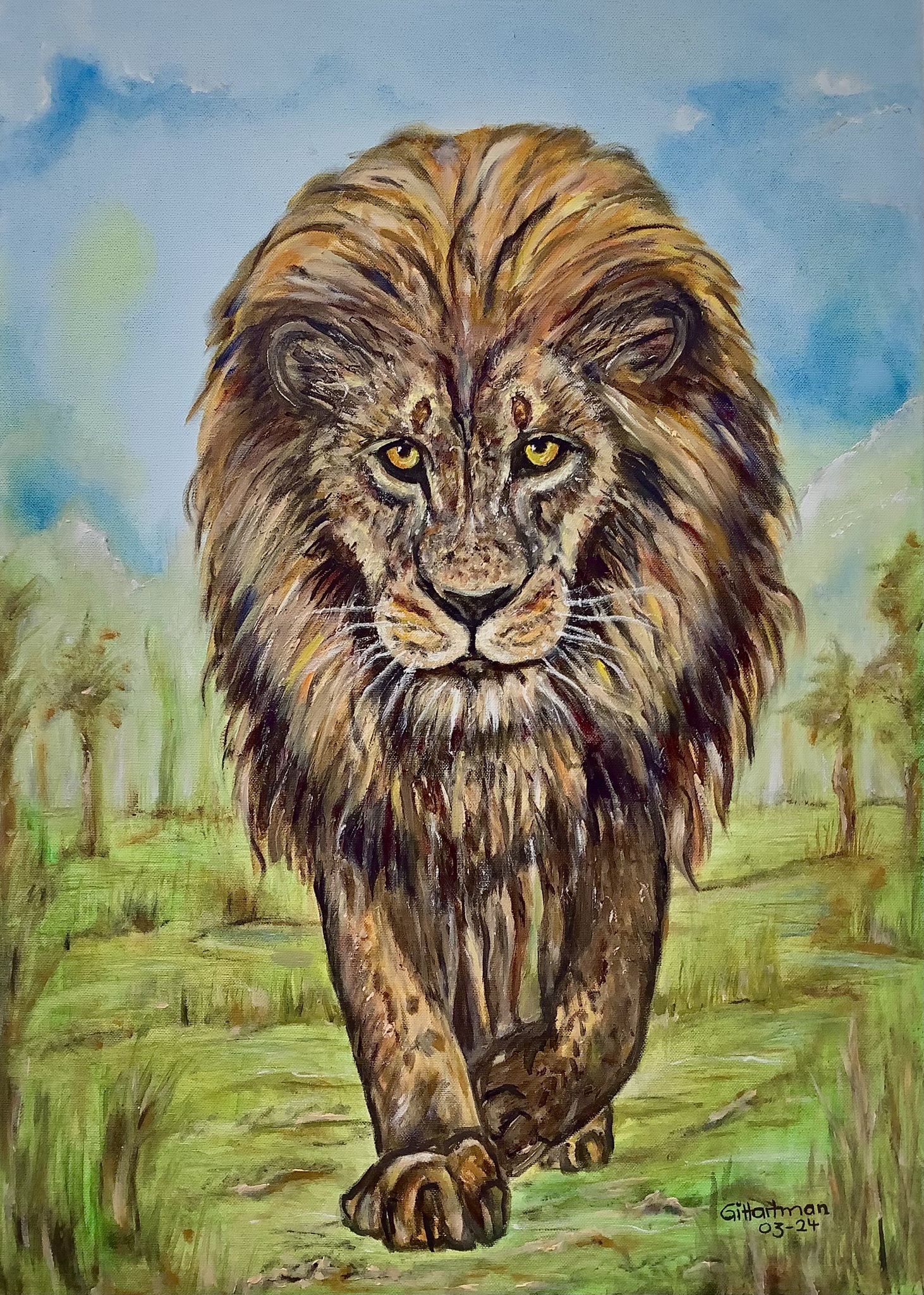 Na de tijger, deze leeuw geschilderd... in traditionele olieverf. imposant, machtig, zelfverzekerd... en hij wéét dat!
