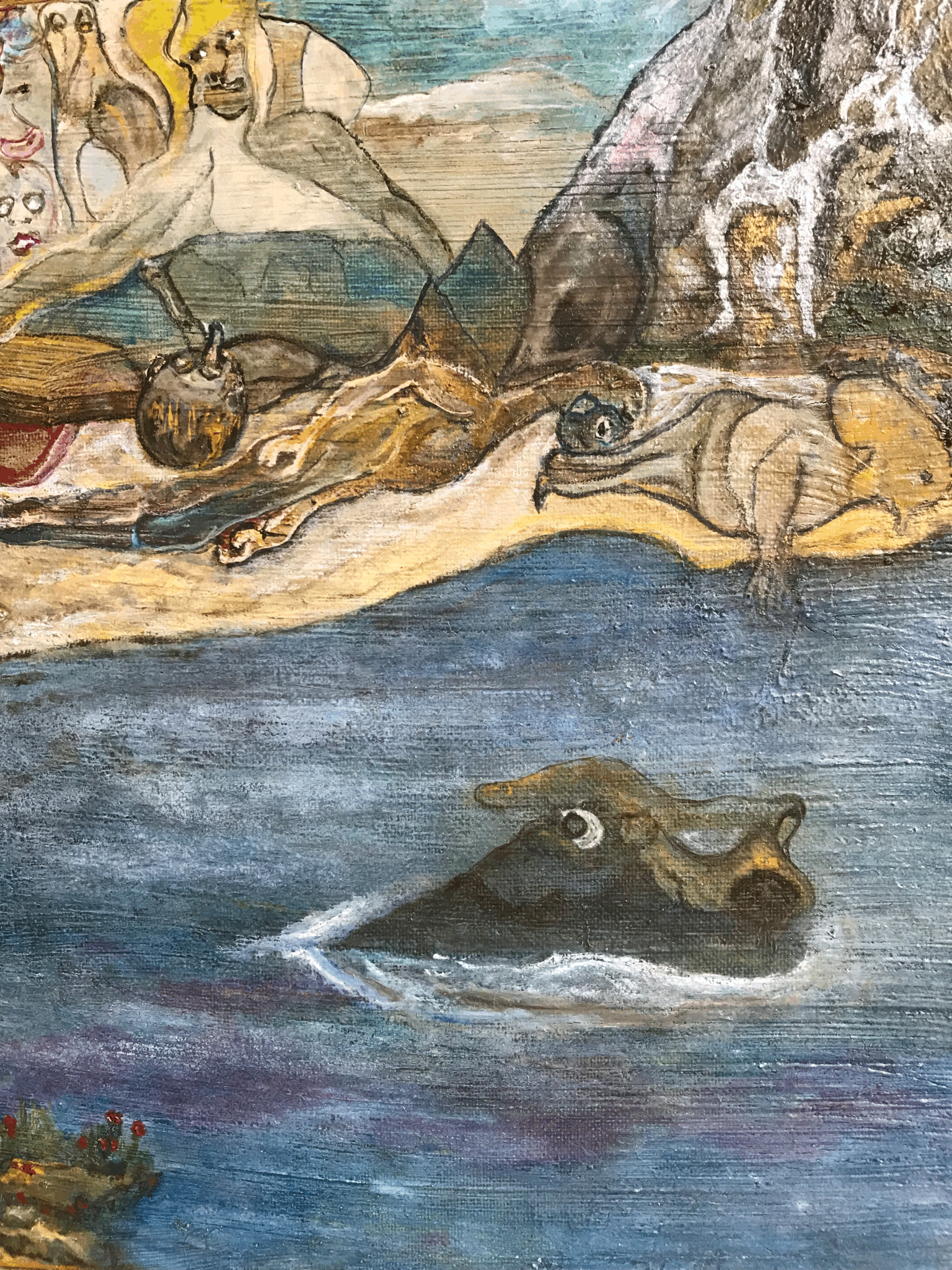 Werkje met een liggende picassofiguur en een vogelman á là Bosch, en niet onbelangrijk op de achtergrond, de ark van Noach, zodat er toch nog een religieus elementje binnen het verhaal speelt. Heeft echter nog duidelijker uitdrukking nodig, maar dat komt wel.