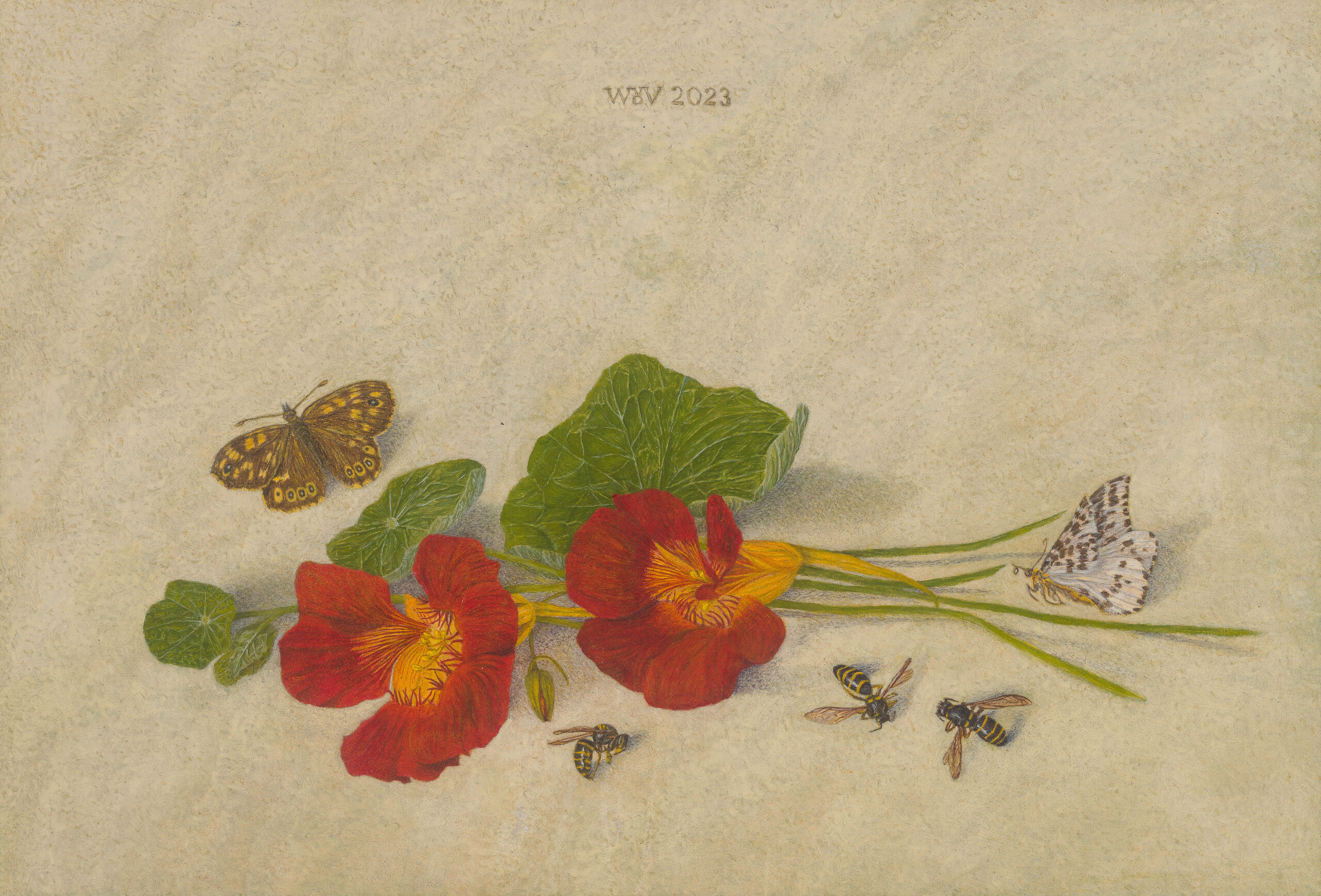Stilleven van Oost-Indische kers met middelste wespen, bont zandoogje en porseleinvlinder