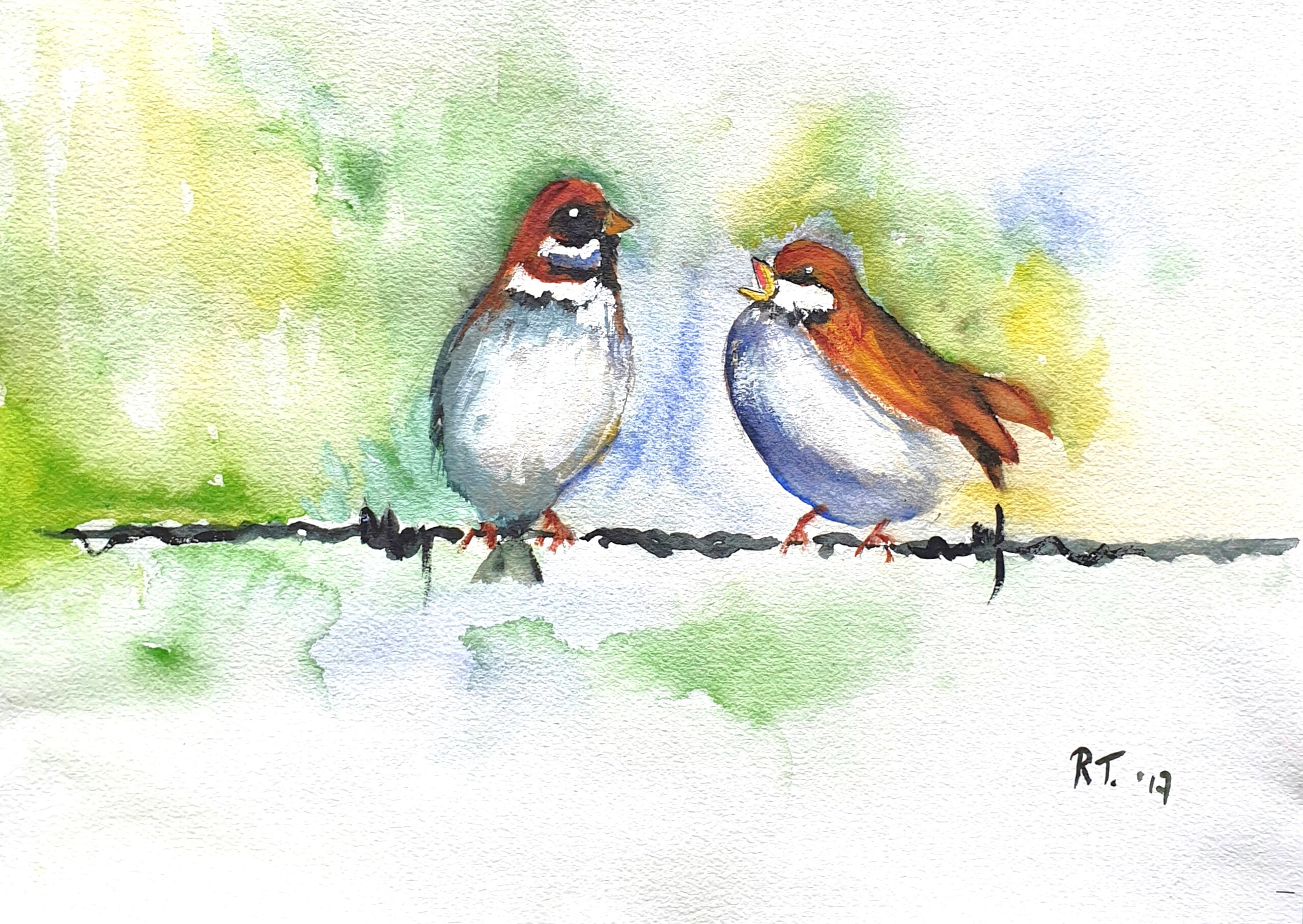 Kunstprinten van dit werk zijn ook verkrijgbaar op canvas, aluminium, plexiglas, posterpapier: Deze aquarel toont twee mussen op een tak, gevangen in een levendig moment van interactie. De rechter vogel lijkt te zingen of iets te vertellen, met de snavel wijd open, terwijl de linker rustig toekijkt. De losse penseelstreken en het frisse kleurgebruik – vooral het zachte groen en geel op de achtergrond – geven het werk een luchtige, natuurlijke sfeer. De roodbruine tinten van de vogels brengen warmte en karakter, terwijl de subtiele details een gevoel van tederheid en levendigheid oproepen.